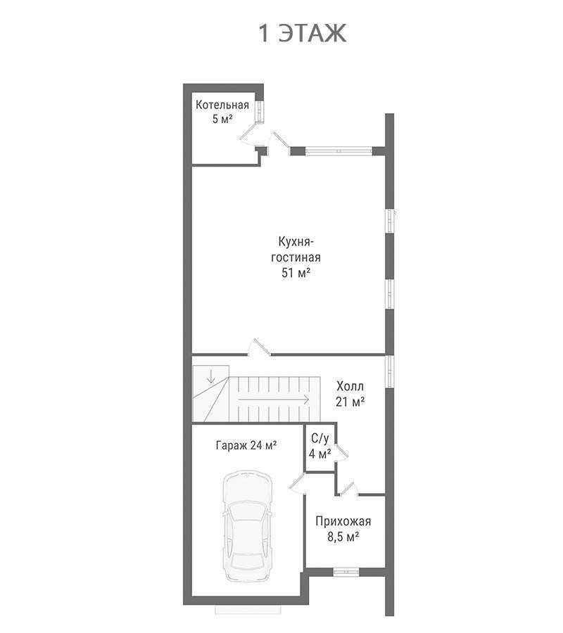 1 этаж: котельная, холл, кухня-гостиная, прихожая, су, гараж.