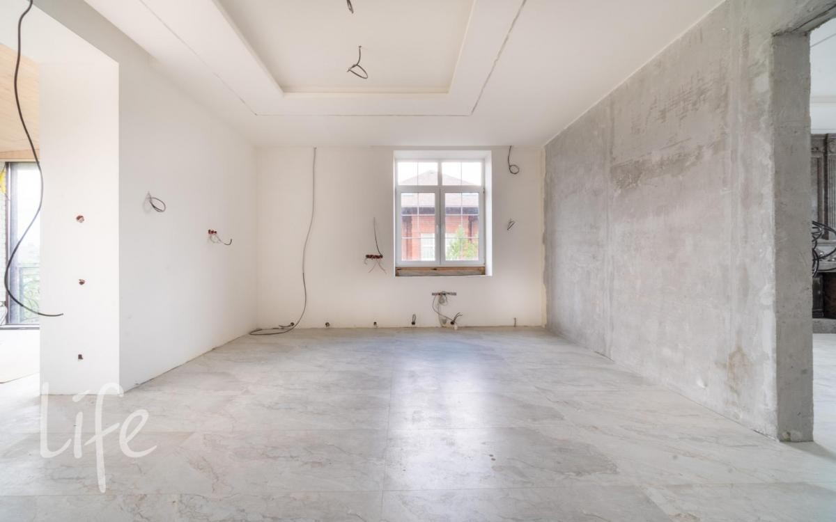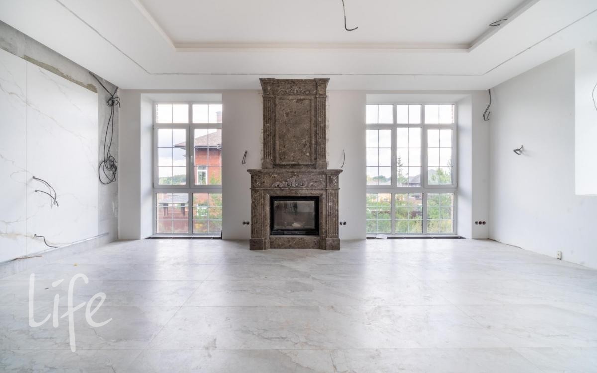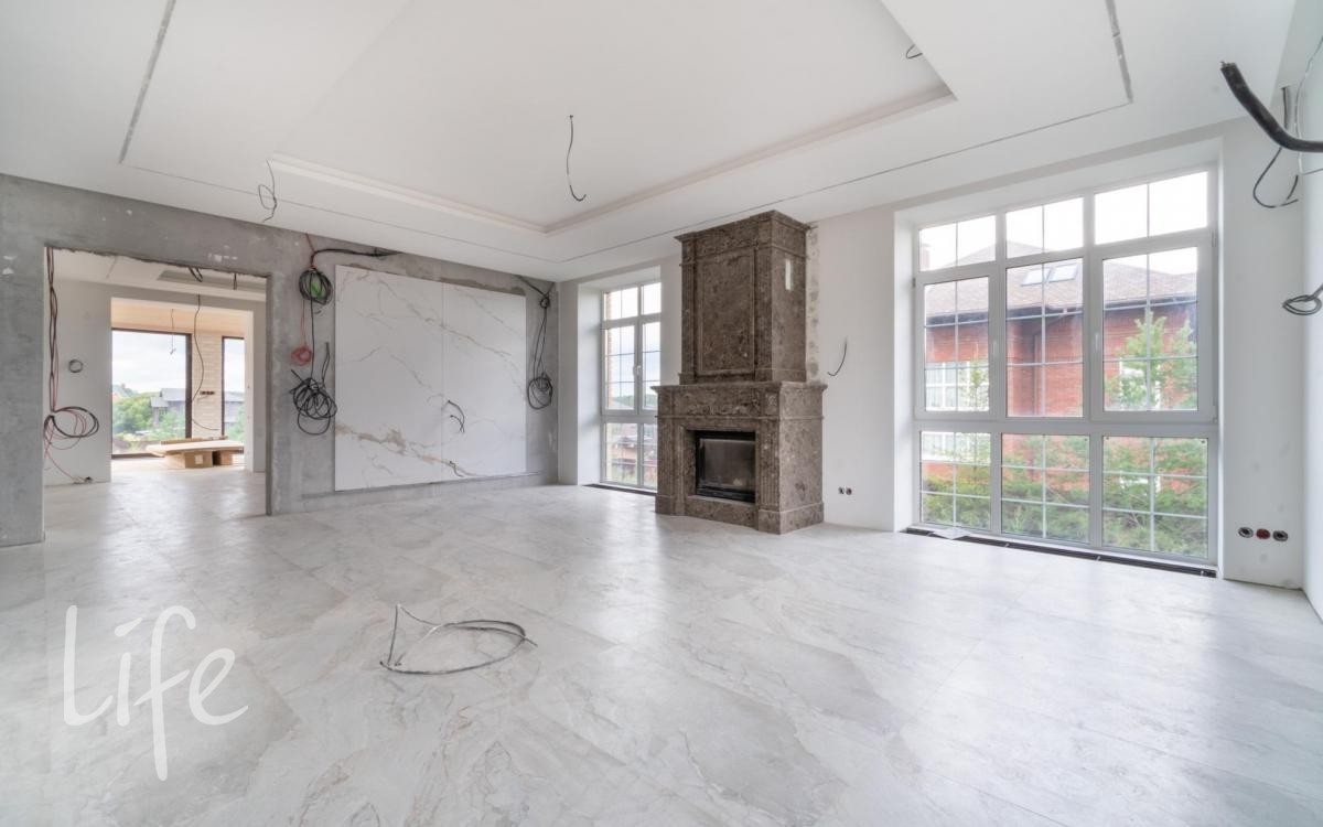 материалов в соответствии с актуальными трендами дизайна. Гостиную с окнами в пол украшает эффектный классический камин с порталом от пола до потолка, отделанный мрамором.