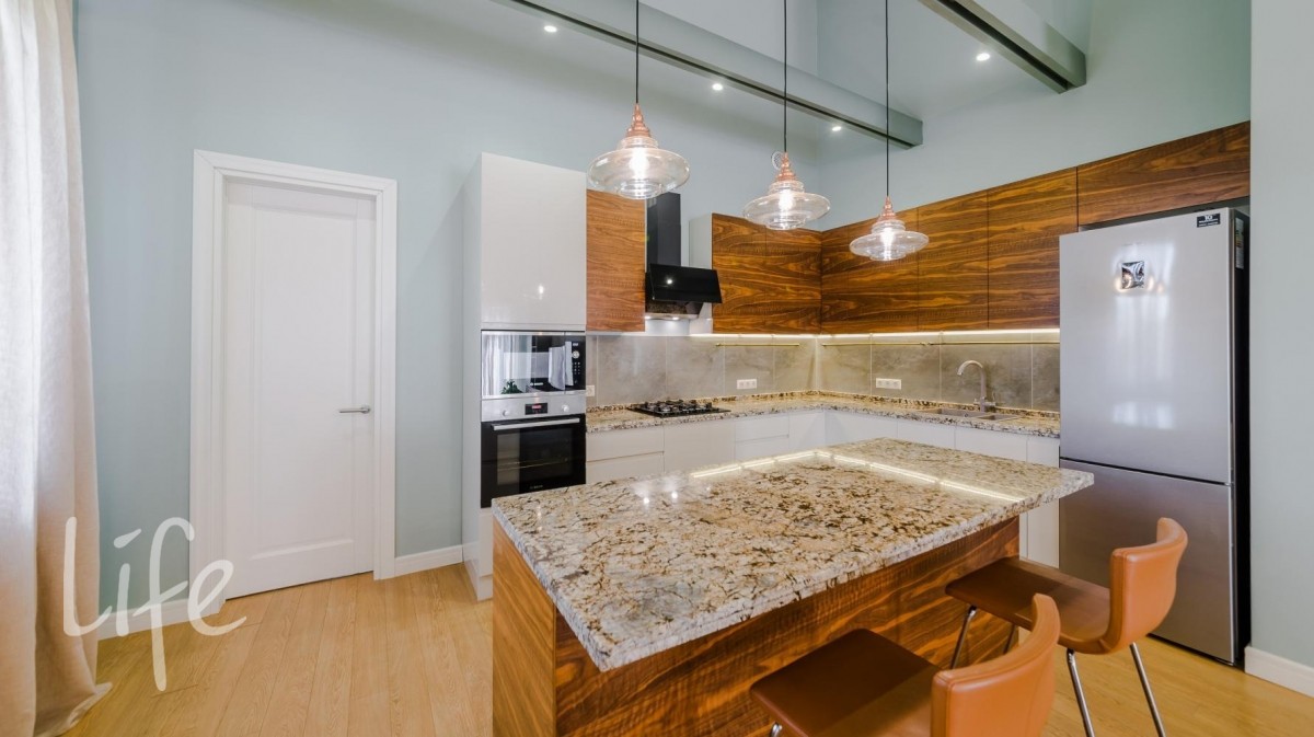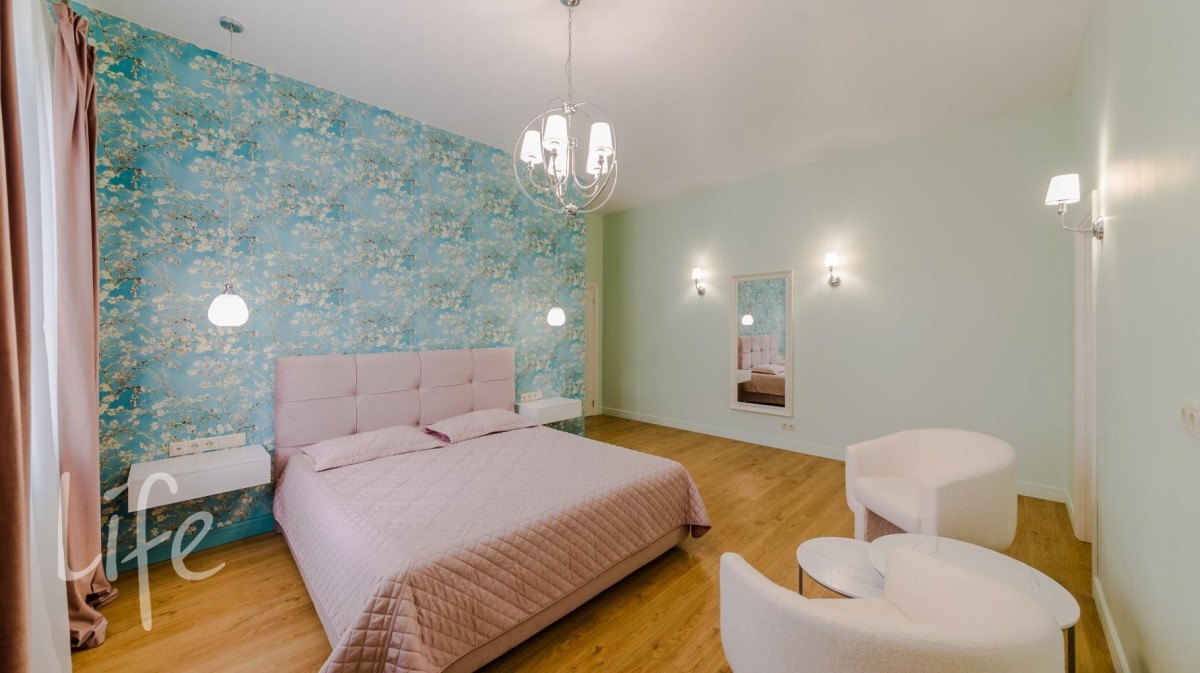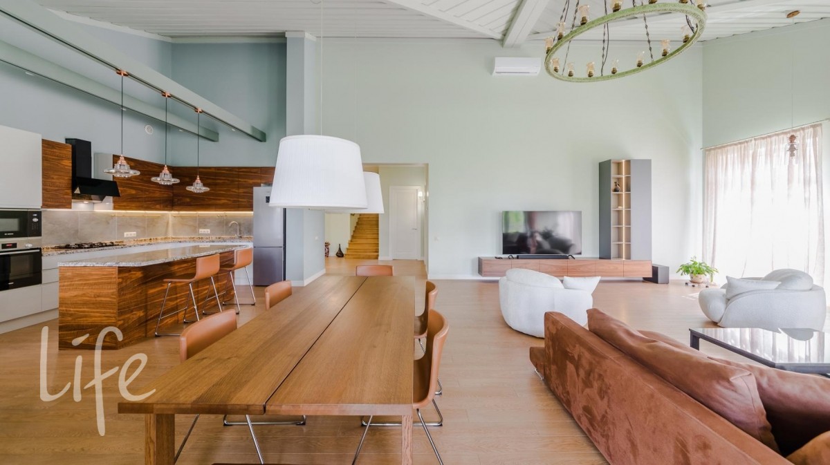 В доме современная удобная планировка. Две спальни на первом этаже. Мастер - спальни и на первом и на втором этажах. В доме просторная гостиная - кухня - столовая более 80кв.м и высокие потолки 6.20м. Из гостиной выход на большую террасу.