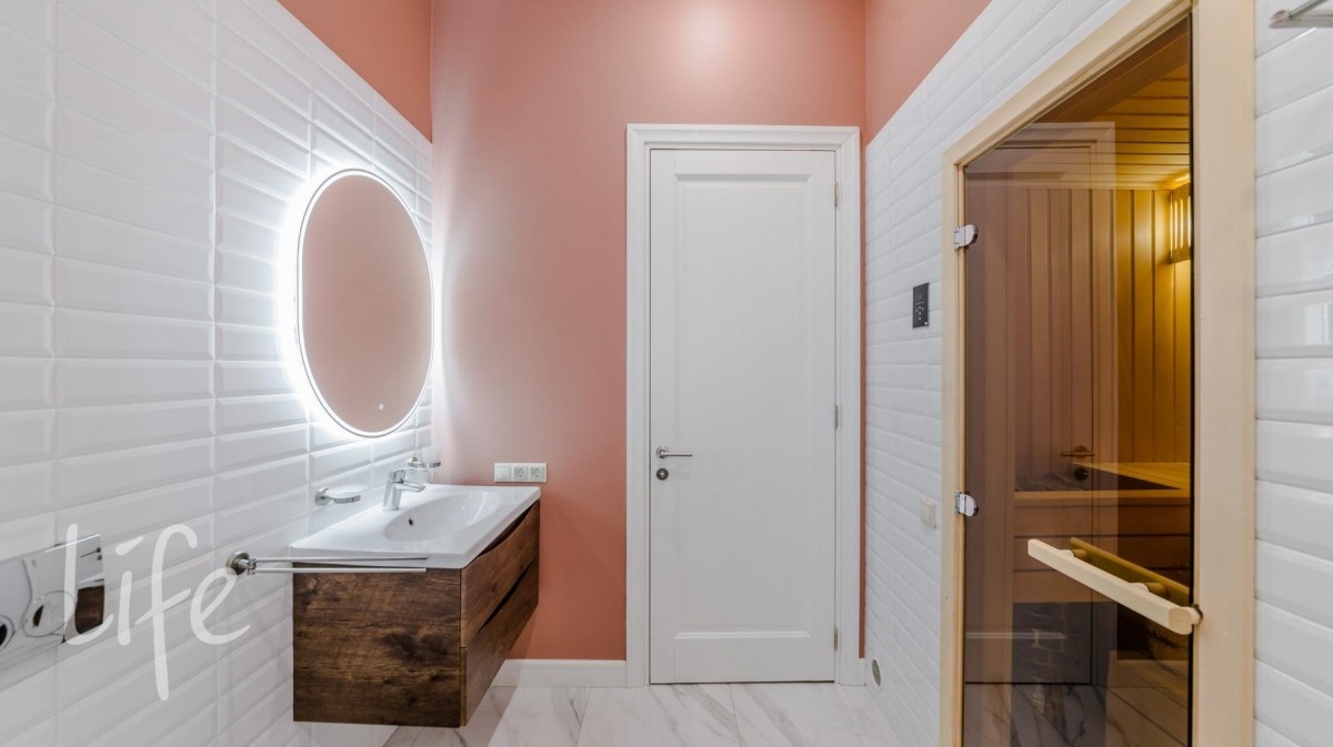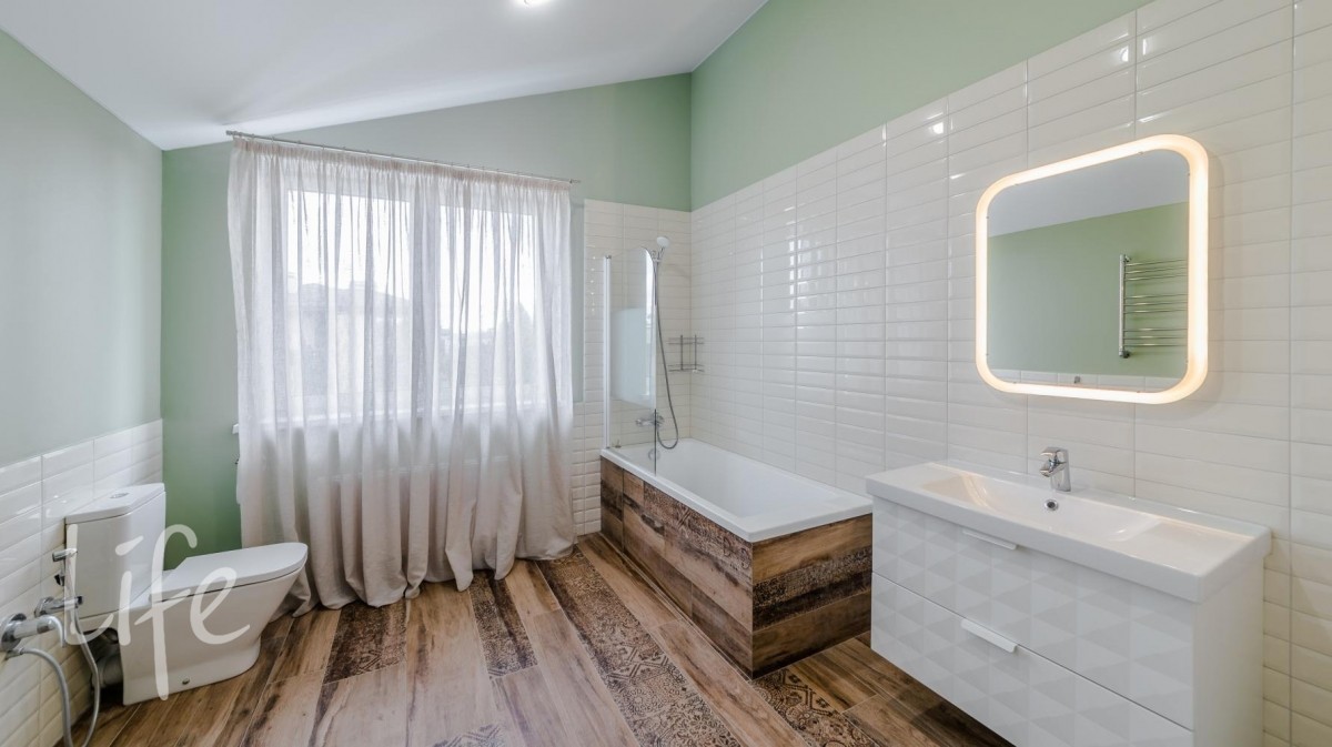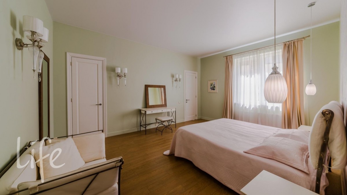 Установлены окна в пол, кондиционеры и теплые водяные полы. Сантехника итальянская, газовое оборудование Buderus. Дом новый, полностью меблирован и готов к проживанию. Есть кабинет, сауна, рабочая кухня, помимо основной, места хранения, постирочная, и теплый гараж.
