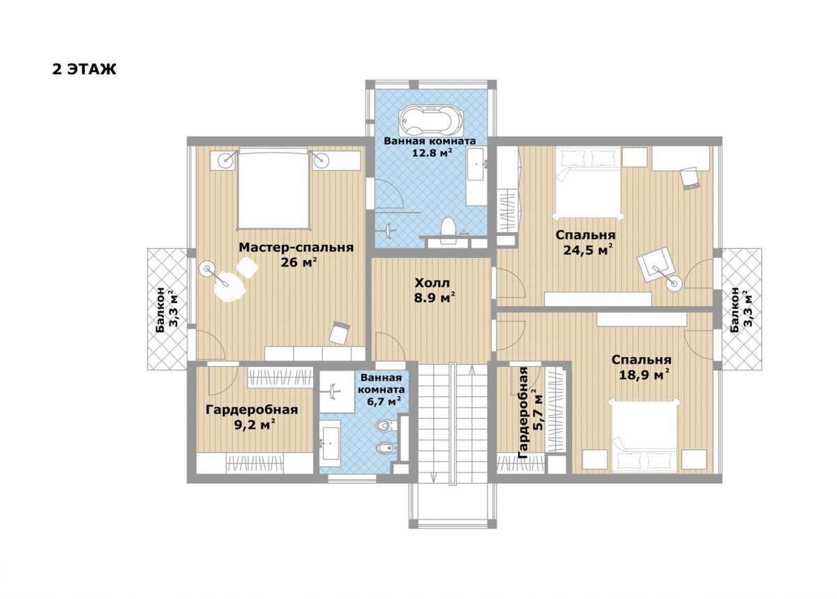 2 этаж: мастер-спальня с гардеробной, ванной комнатой и балконом, спальня с гардеробной, спальня, балкон, су, холл.