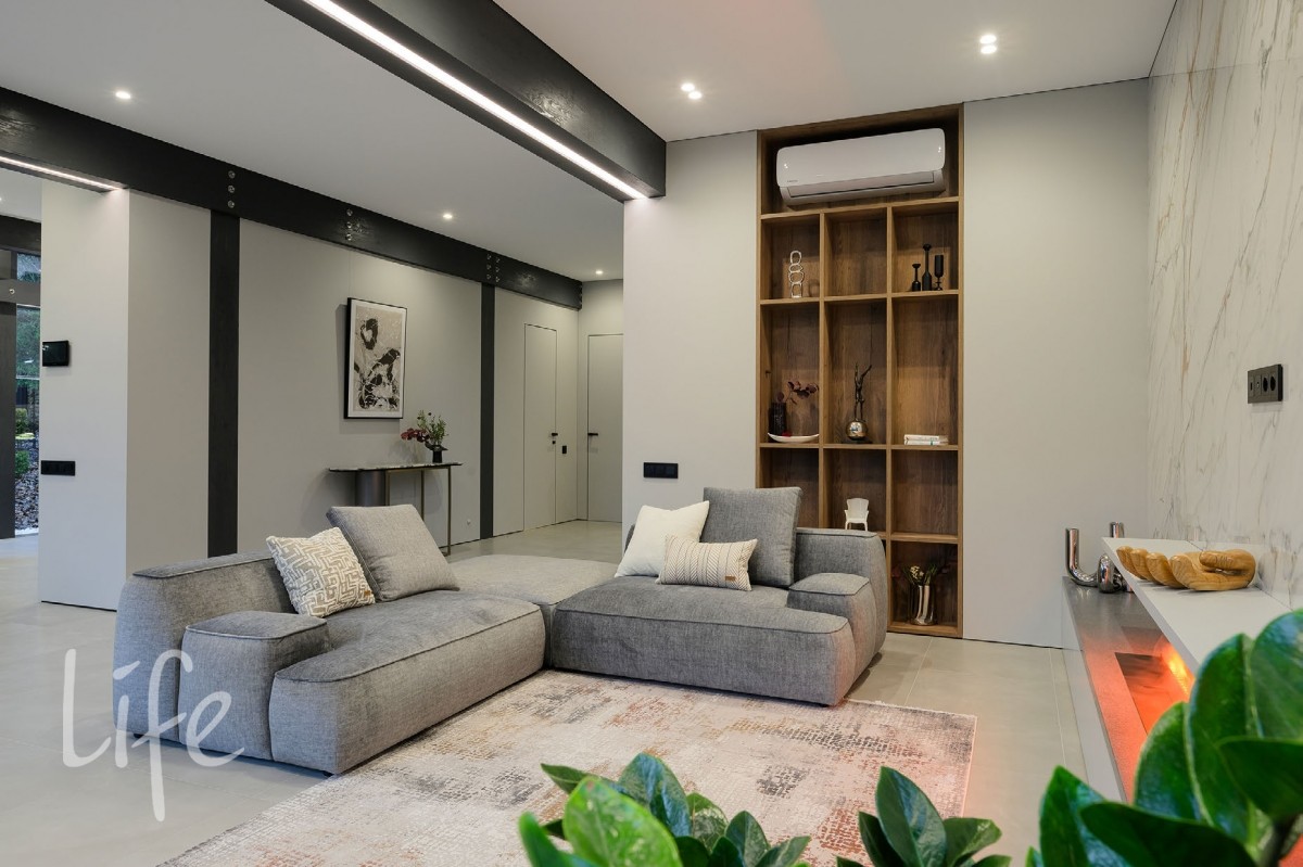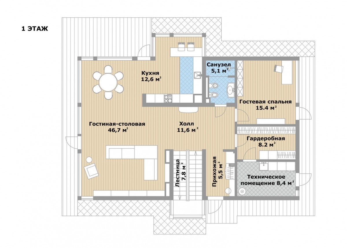 1 этаж: прихожая, гардеробная, холл, гостиная-столовая с выходом на патио, гостевая спальня-кабинет с выходом на террасу, котельная-постирочная.