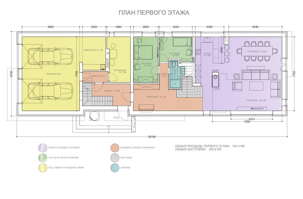1 этаж: прихожая, гостиная - кухня -столовая, терраса, гостевая спальня, с/у, гаражна 2 м/м.