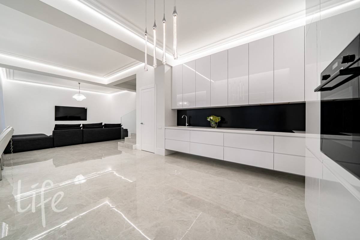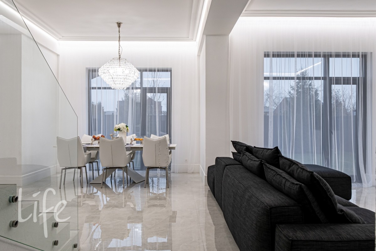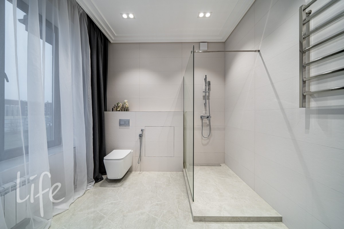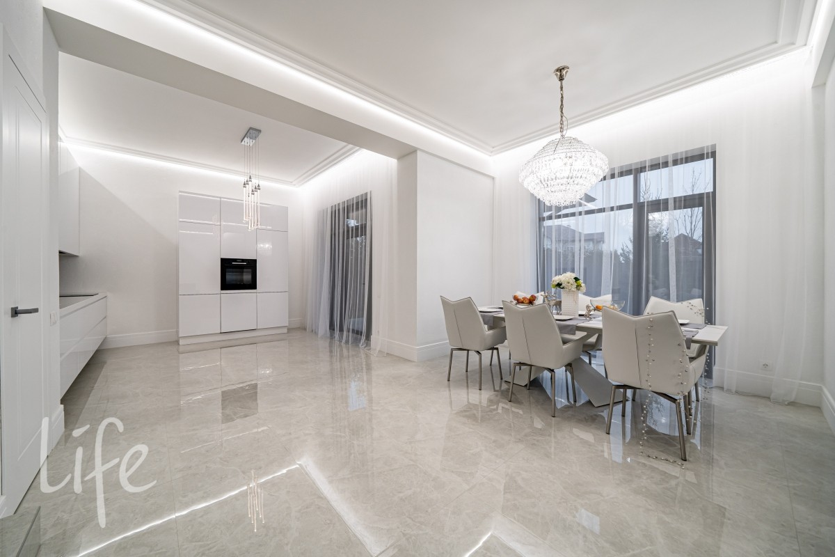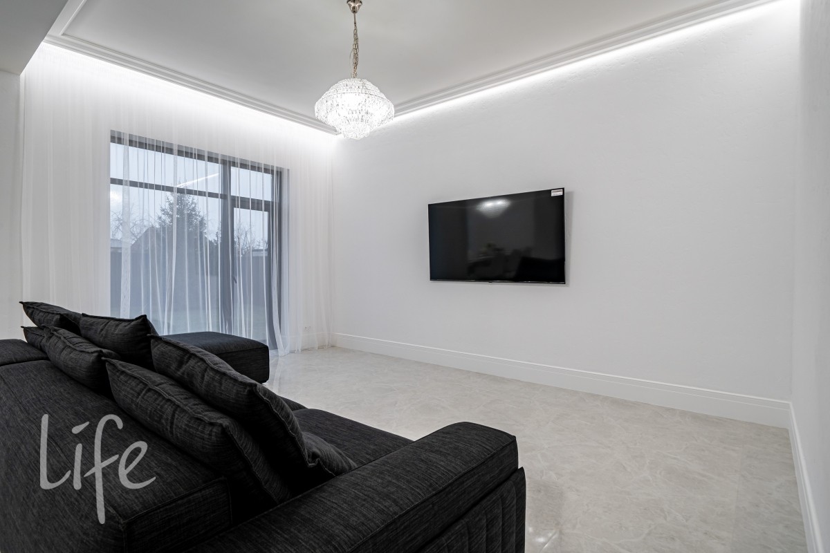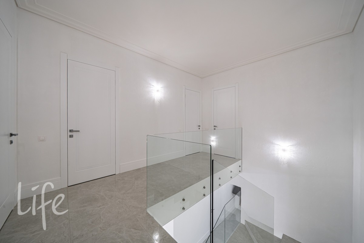 Дом находится в состоянии под ключ: полы — керамогранит, стены — под покраску, потолки — полностью завершены. Все санузлы оборудованы качественной