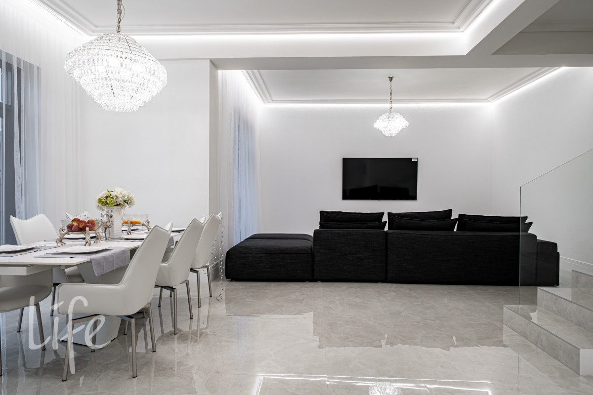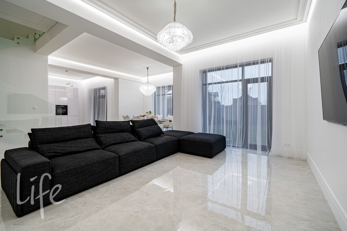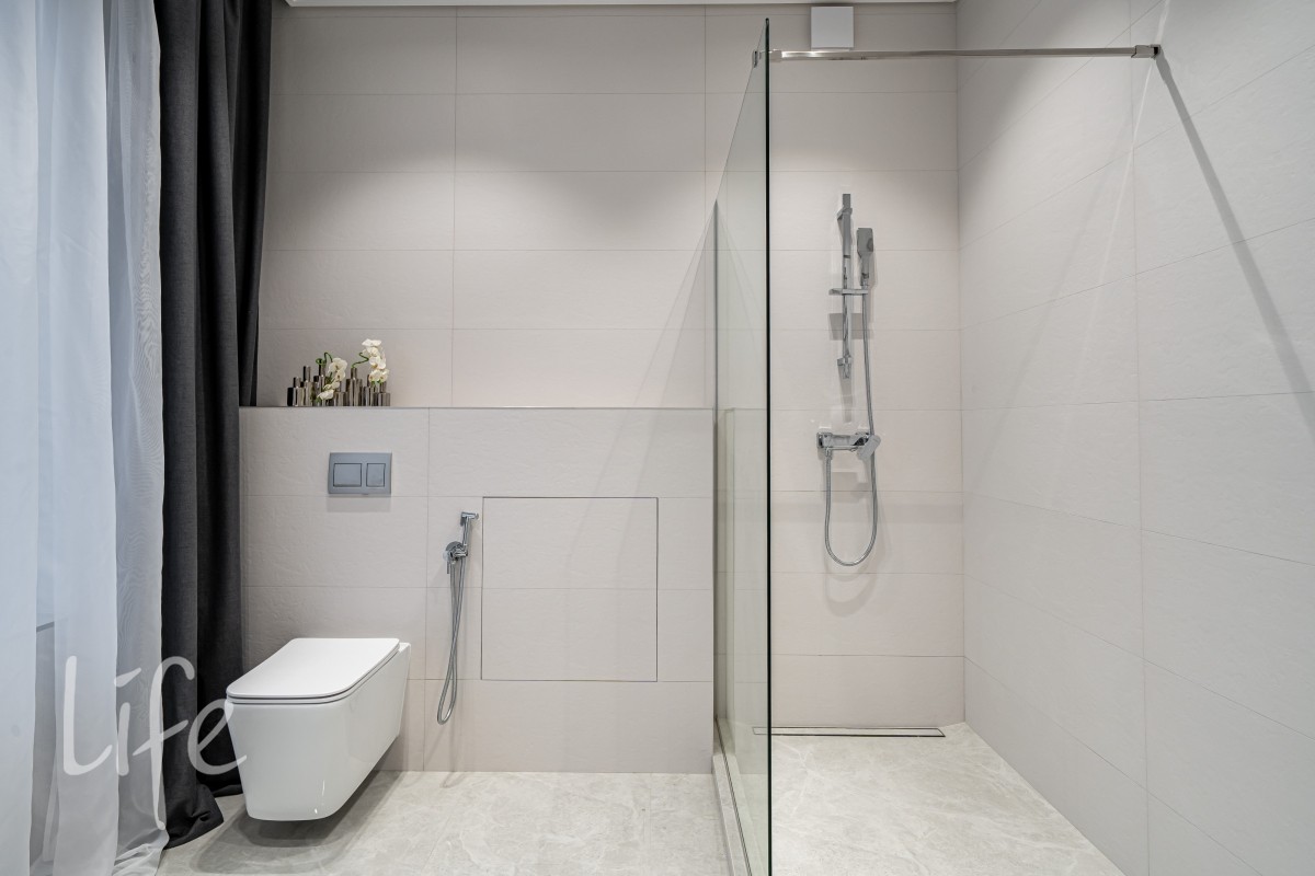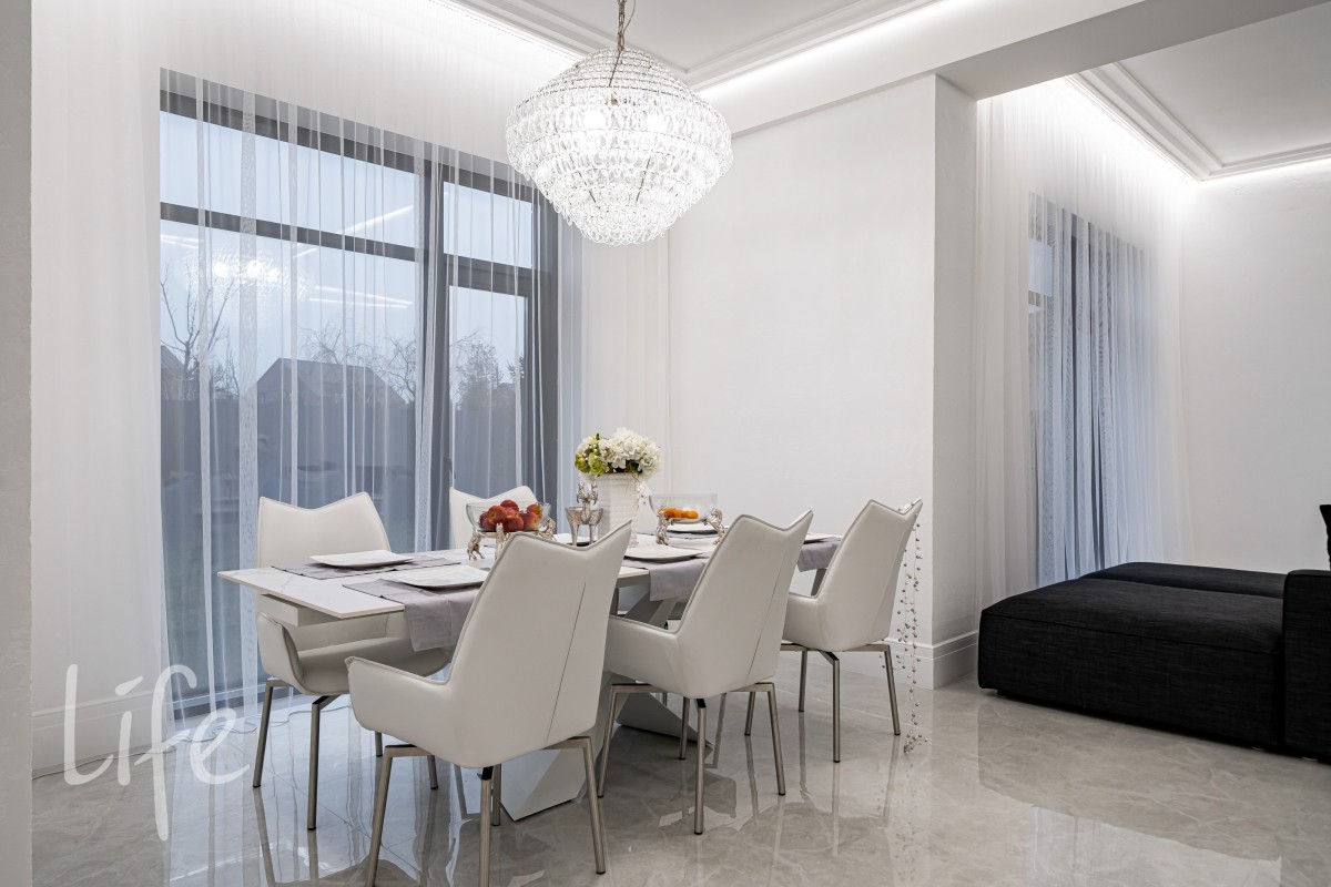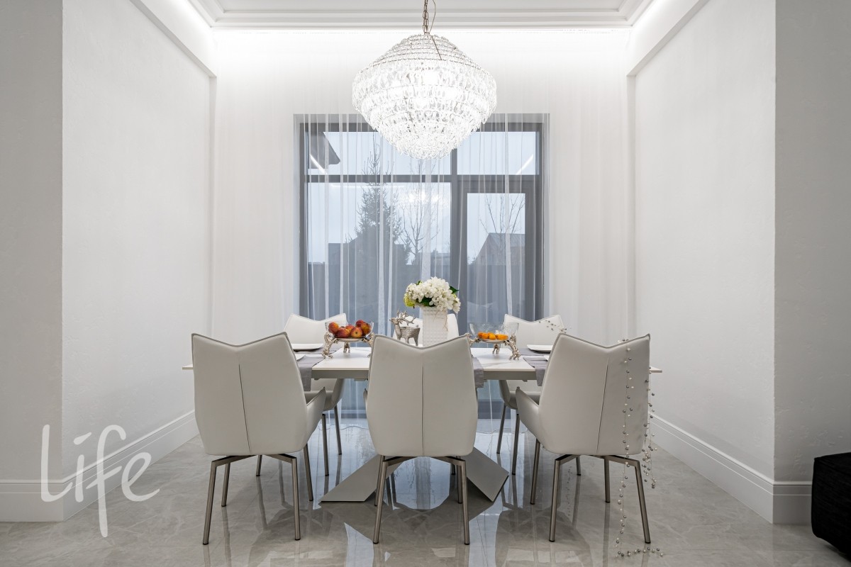 Дом находится в состоянии под ключ: полы — керамогранит, стены — под покраску, потолки — полностью завершены. Все санузлы оборудованы качественной