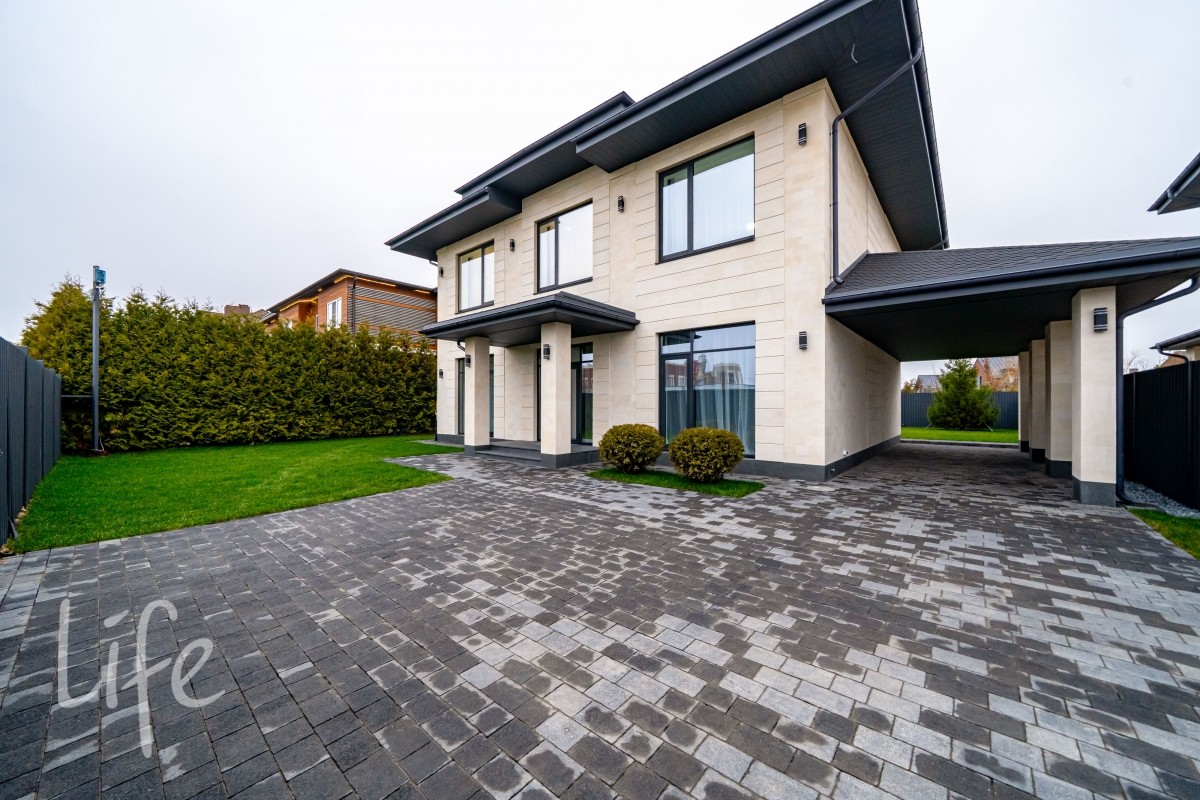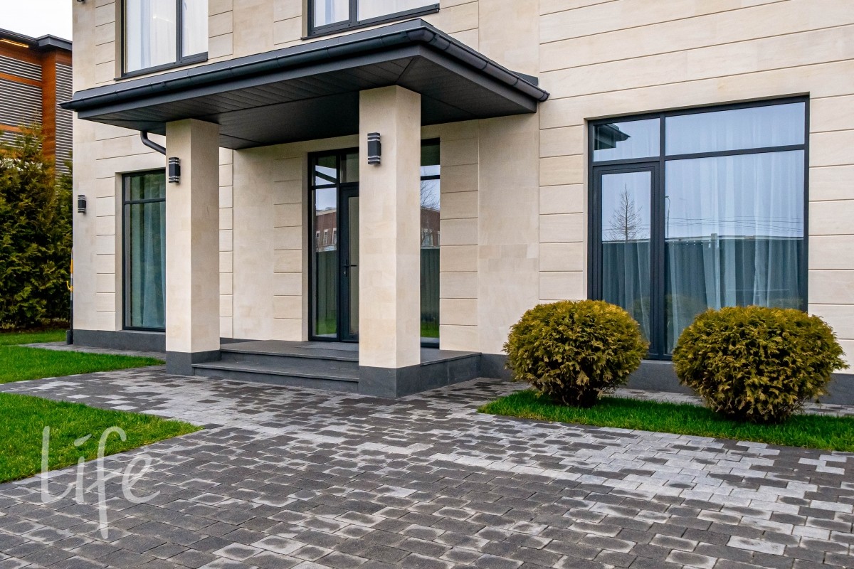 алюминиевые окна, уложена премиальная брусчатка Steingot. Забороснащён электроприводом.