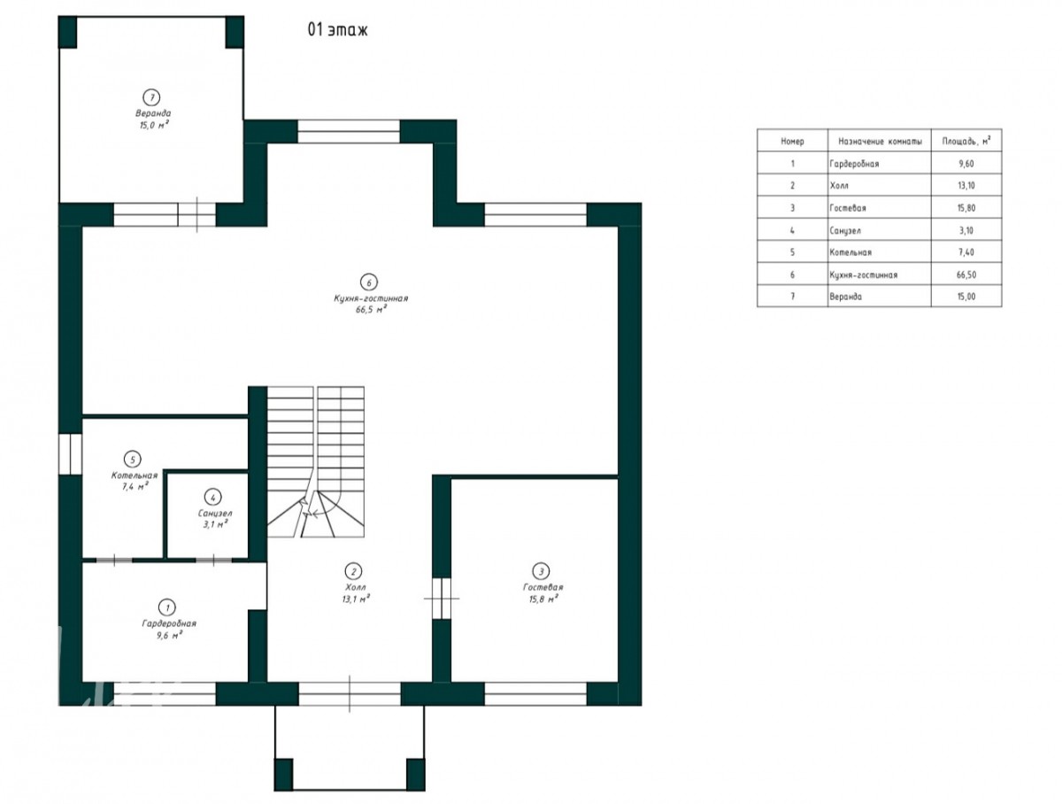 1 этаж: холл, гардеробная, гостиная, кухня с выходом на веранду, комната гостевая, с-у, постирочная, котельная.