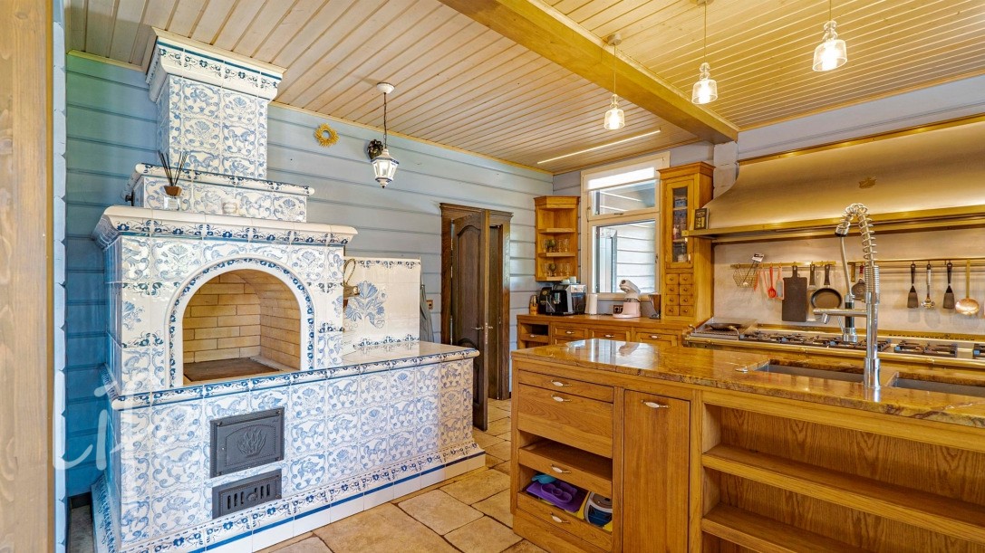 1 этаж: просторная прихожая с гардеробной для верхней одежды и обуви, 2 су, отапливаемый гараж на 4 мм, гостиная и столовая со вторым светом, кухня, русская печь по проекту компании Паллада, облицованная изразцами, кладовая для хранения продуктов.