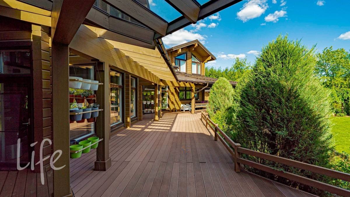 Вся задняя часть дома окружена просторной террасой.