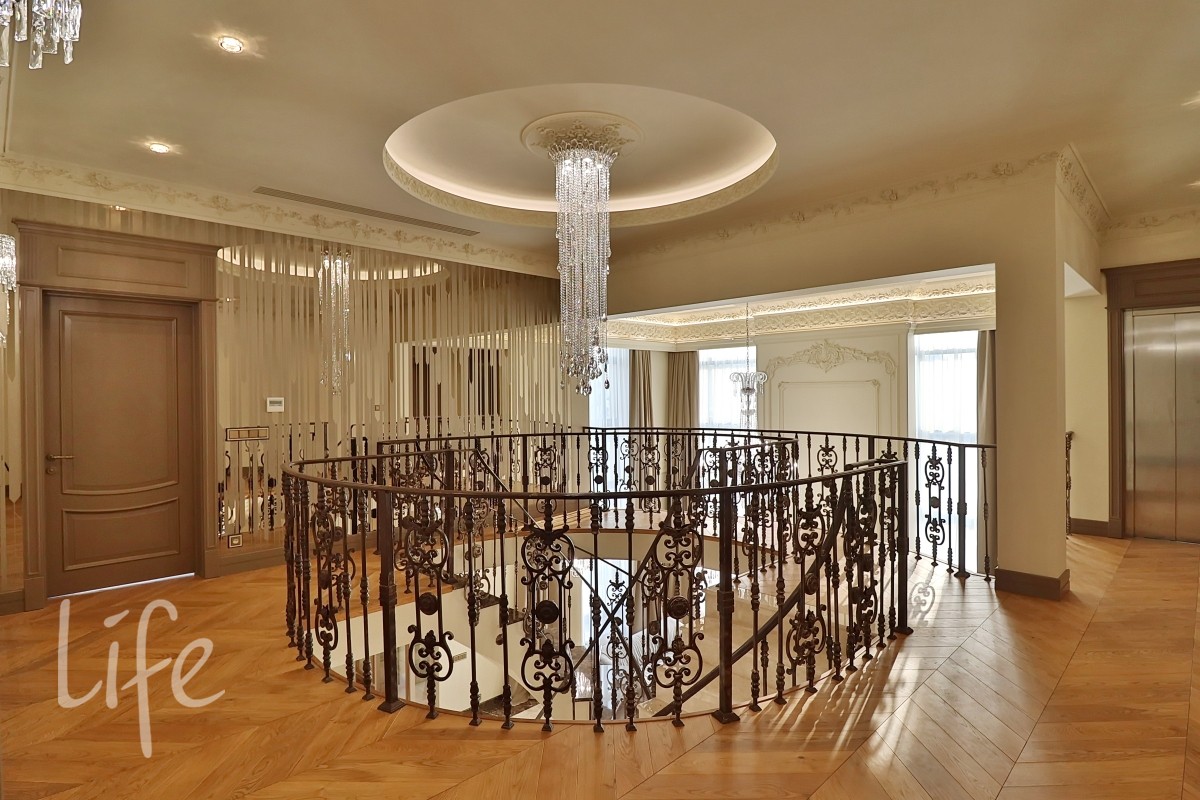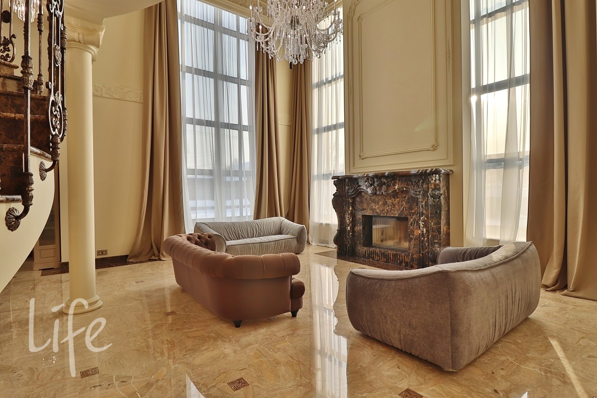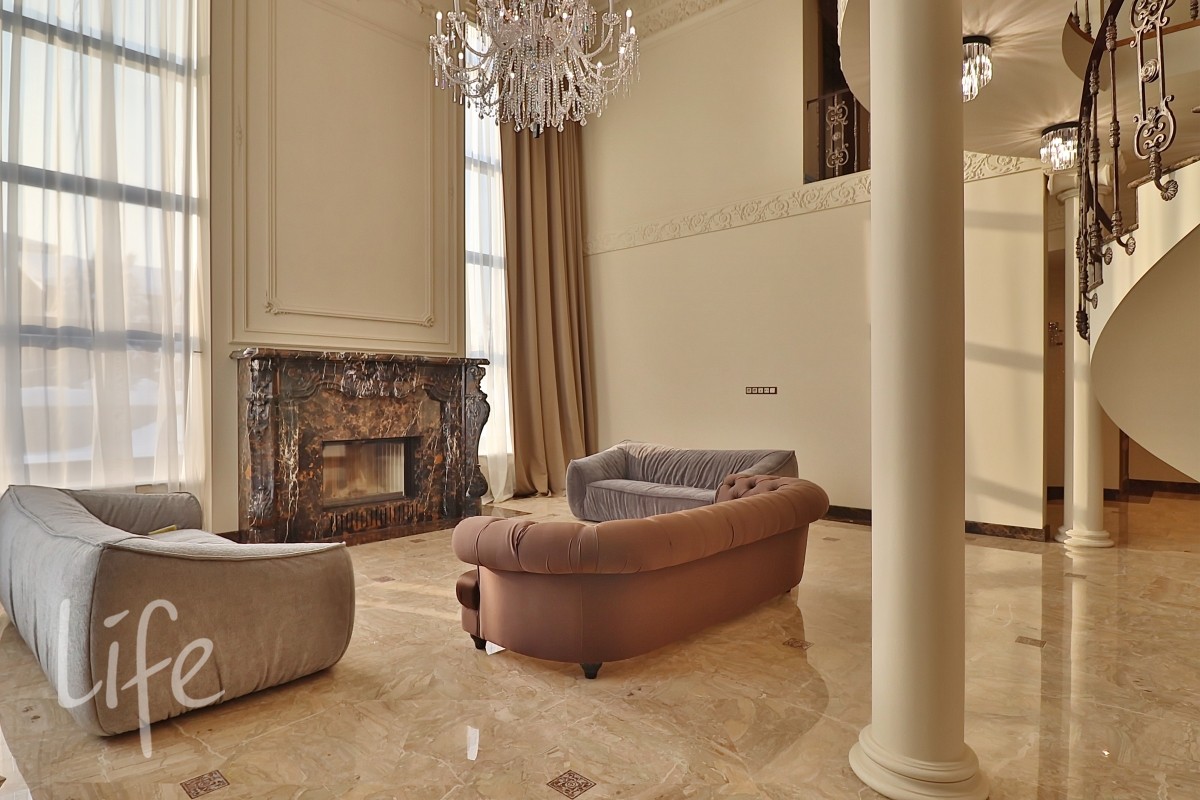 Интерьер выполнен в современном классическом стиле, в мягких тонах, со вкусом подобрана мебель, привезенная из Италии, и аксессуары. Гостиную со вторым светом украшает шикарный дровяной камин.
