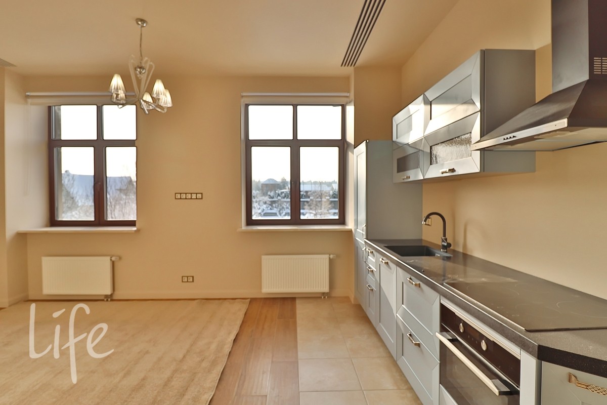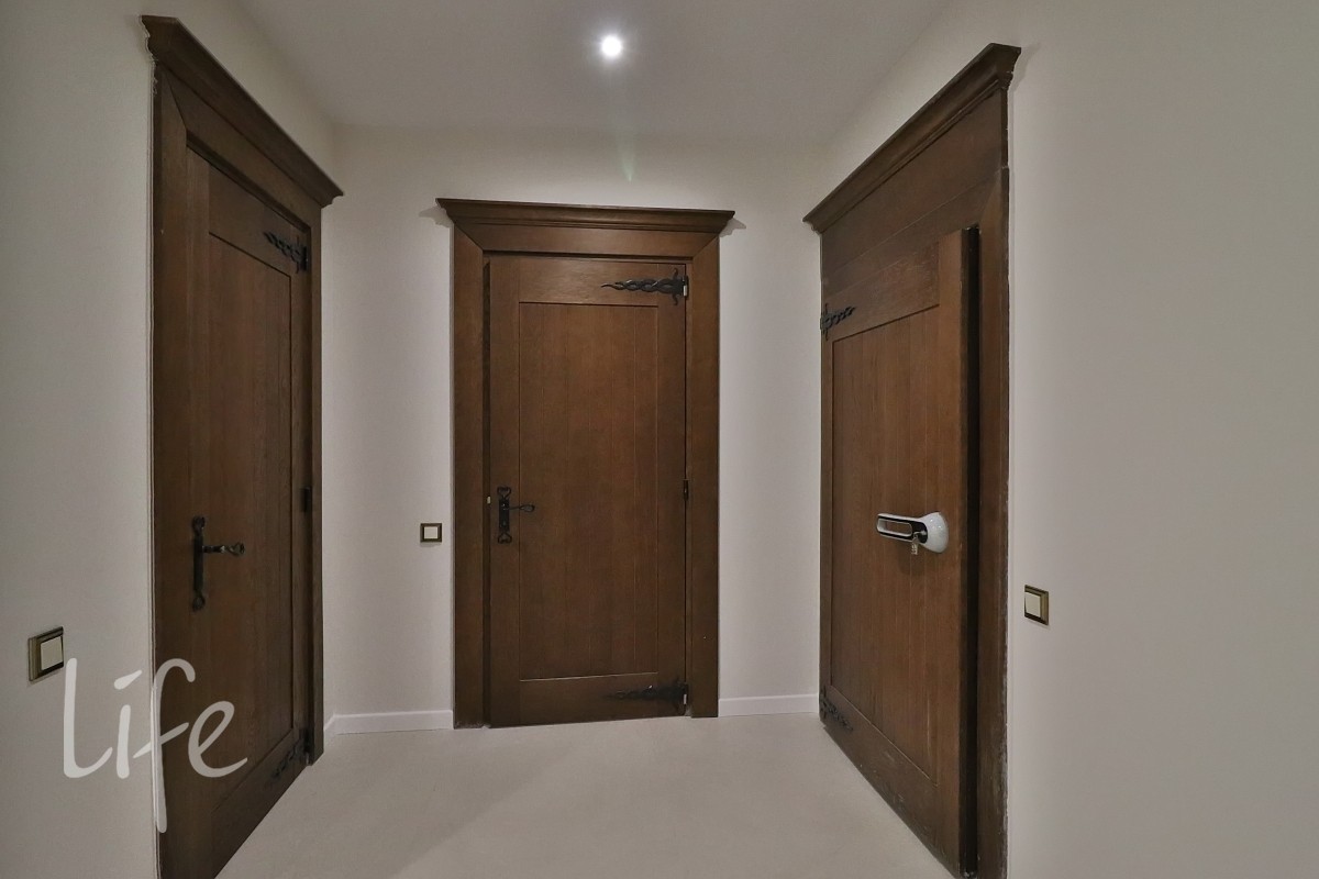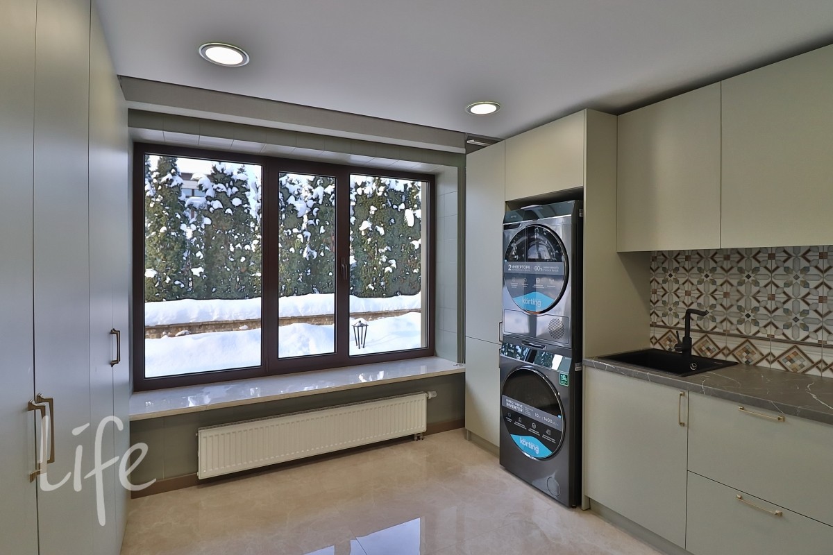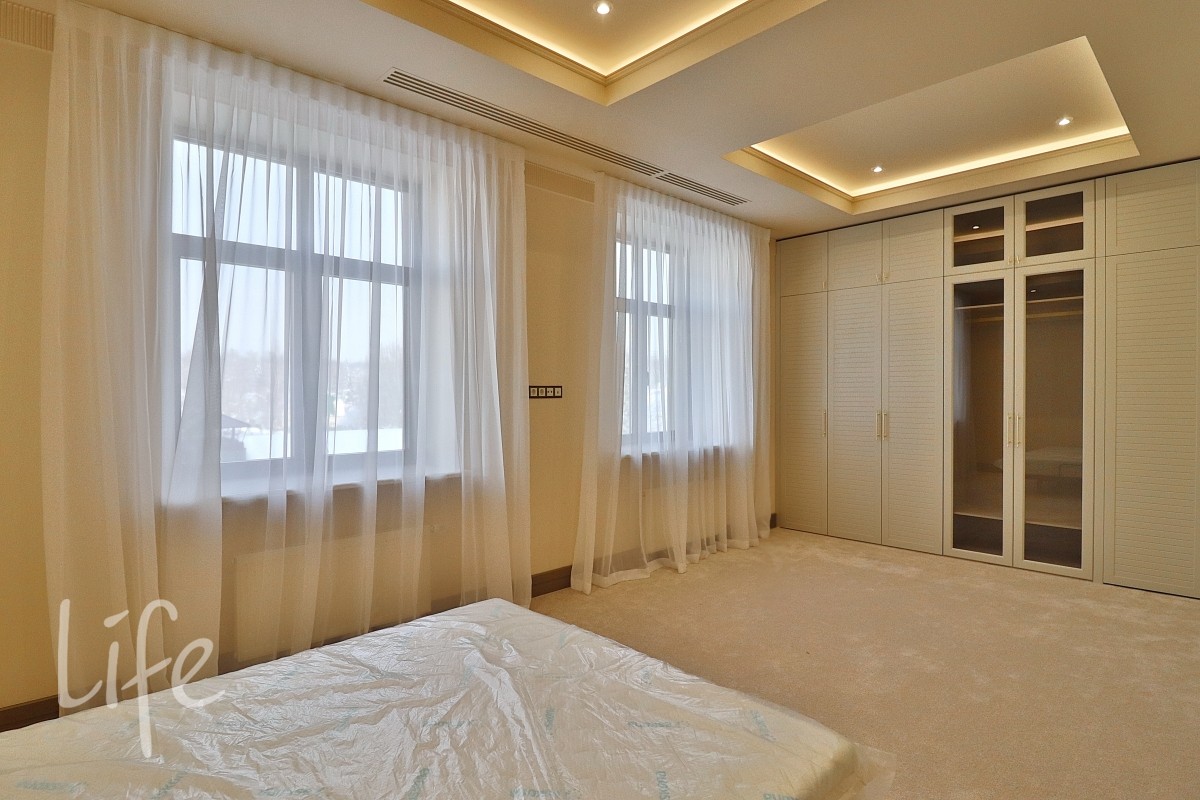 Интерьер выполнен в современном классическом стиле, в мягких тонах, со вкусом подобрана мебель, привезенная из Италии, и аксессуары. Гостиную со вторым светом украшает шикарный дровяной камин.