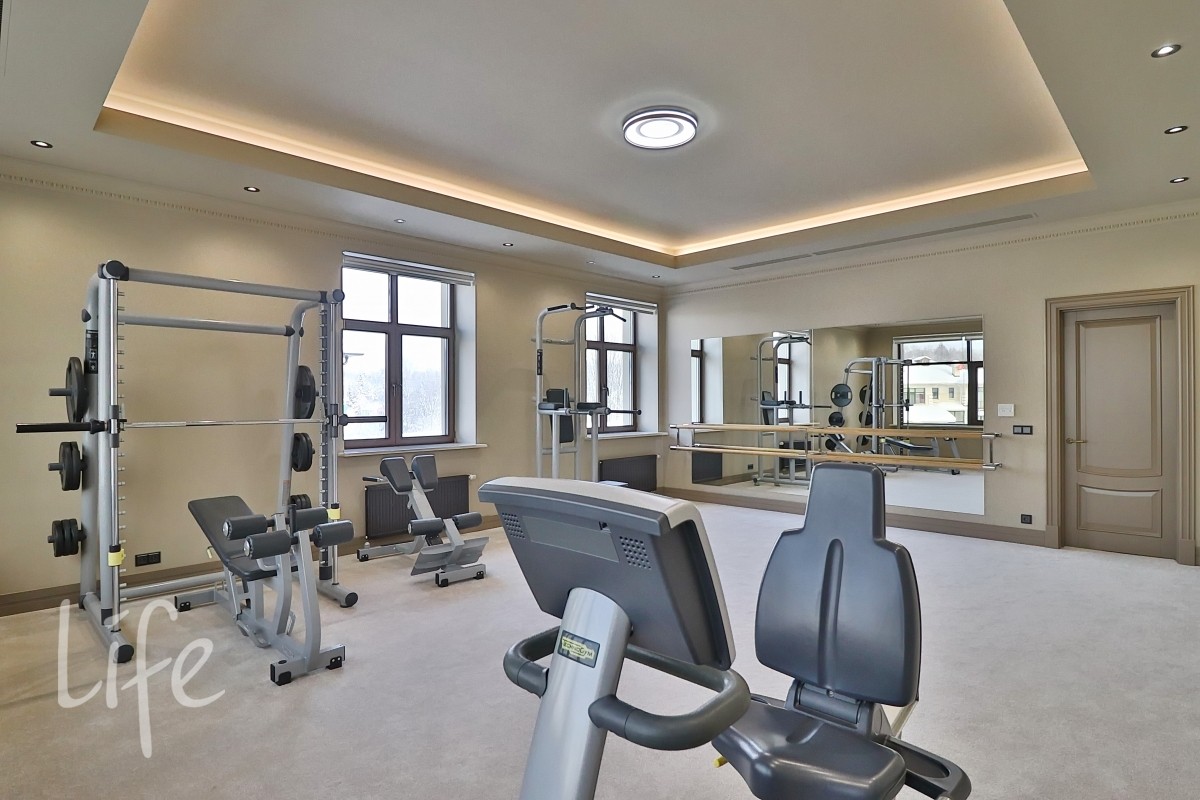 2 этаж: холл, лифт, поделен на два крыла, в одном расположены две спальни с с/у и кухней, тренажерный зал, во втором хозяйском крыле — мастер-спальня с с/у и гардеробной, спальня с с/у и гардеробной, спальня с с/у, балконы.