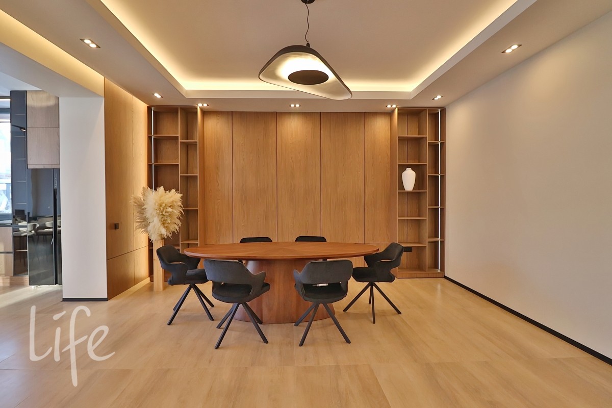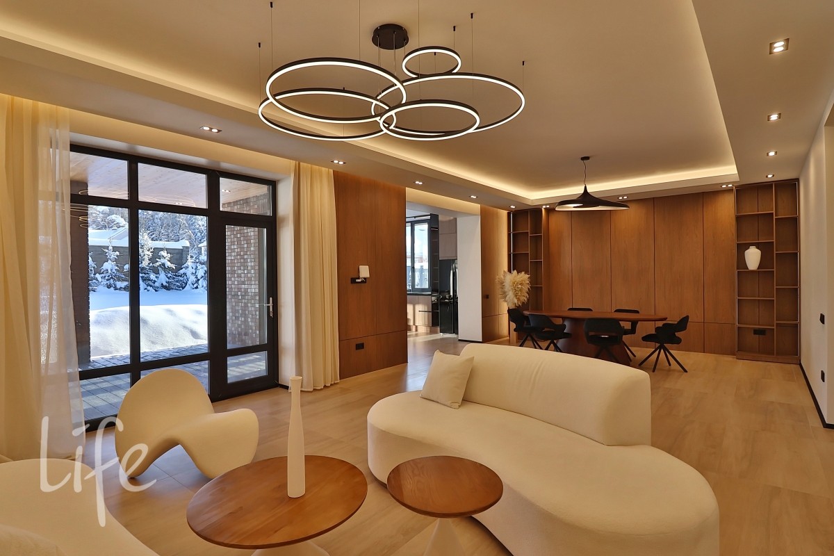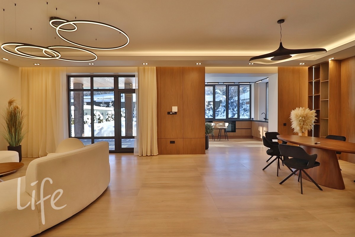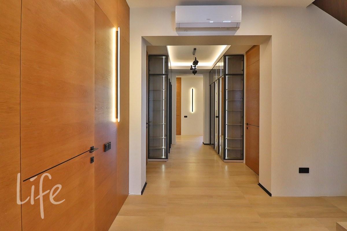 Интерьер в современном стиле, в светлых мягких тонах, с использованием декоративных деревянных панелей, встроенной мебели и дверей в одной цветовой гамме. Современные системы освещения. Со вкусом подобрана удобная мебель и аксессуары.