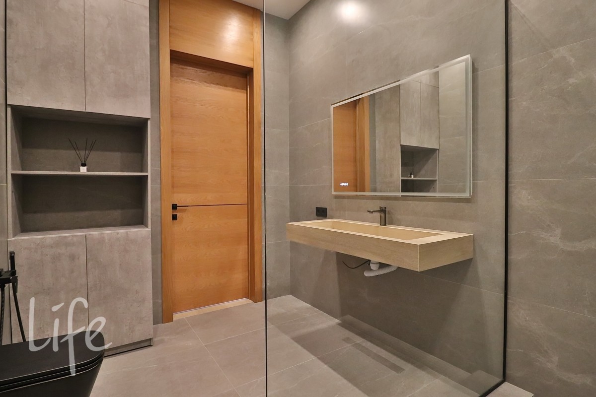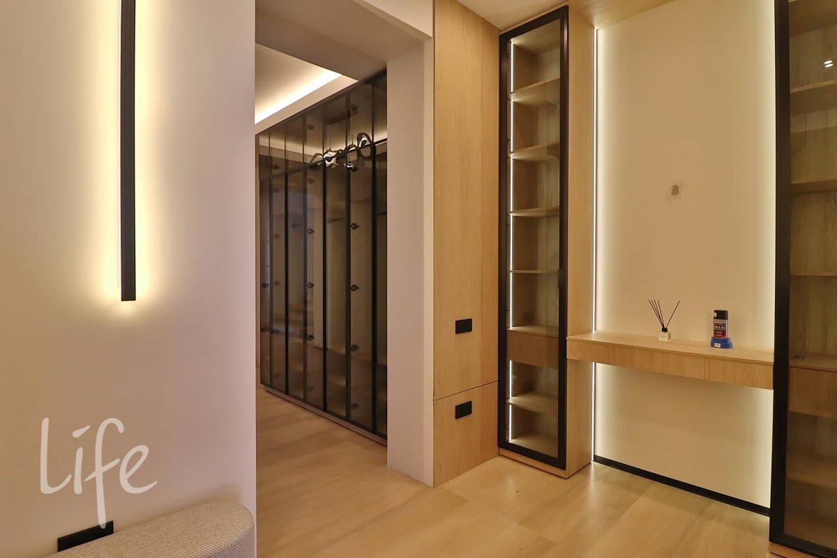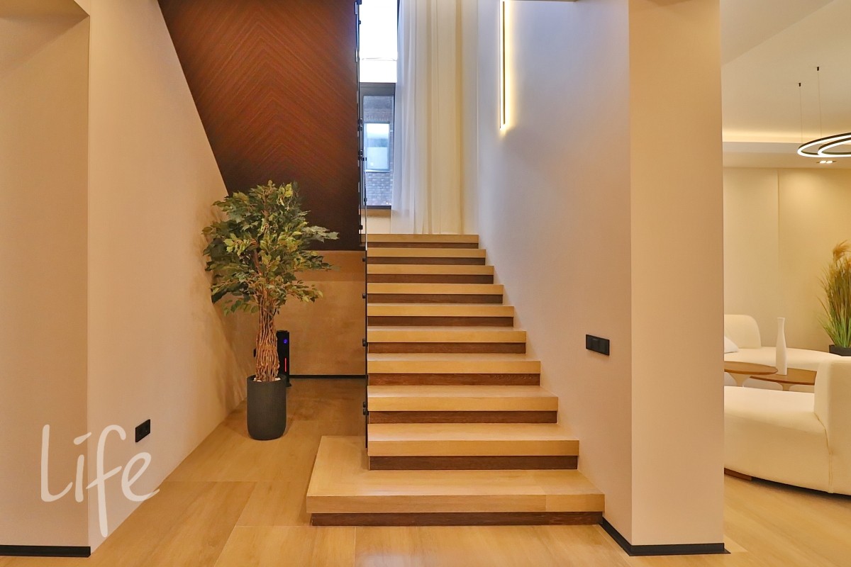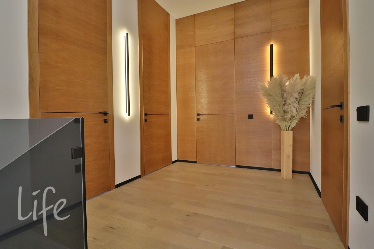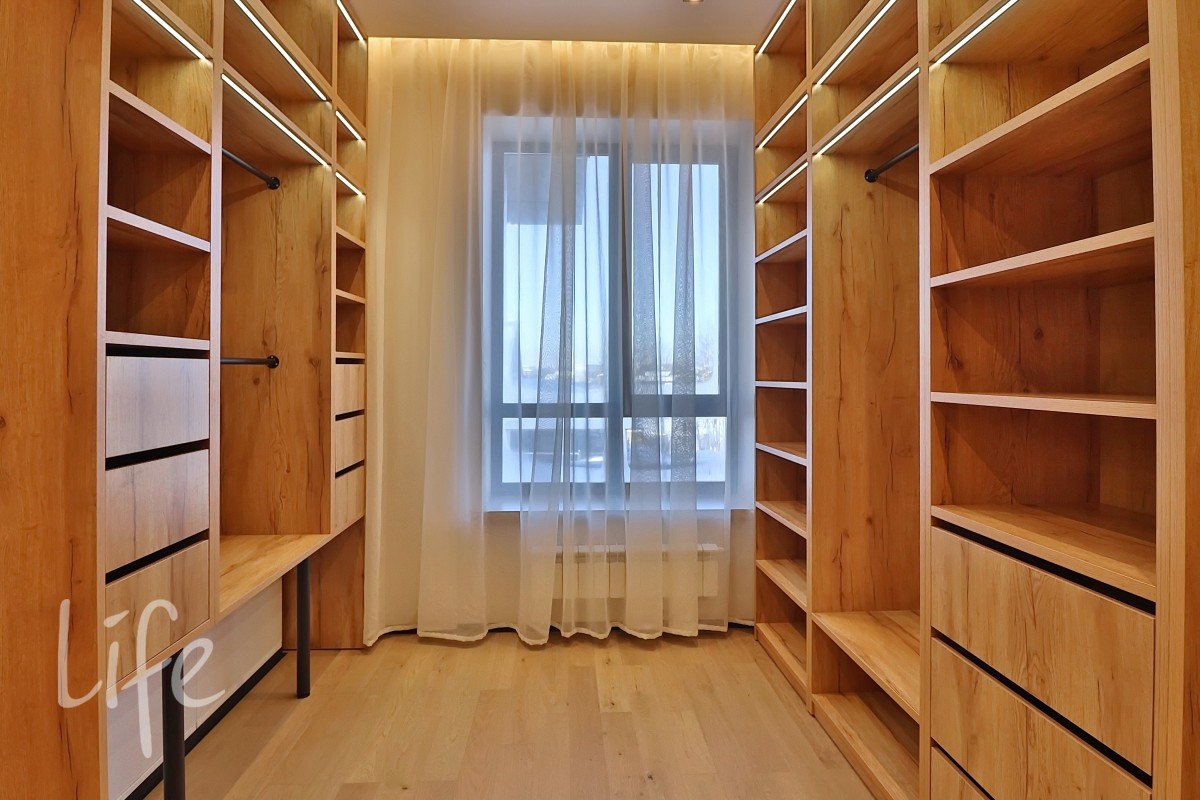 Интерьер в современном стиле, в светлых мягких тонах, с использованием декоративных деревянных панелей, встроенной мебели и дверей в одной цветовой гамме. Современные системы освещения. Со вкусом подобрана удобная мебель и аксессуары.