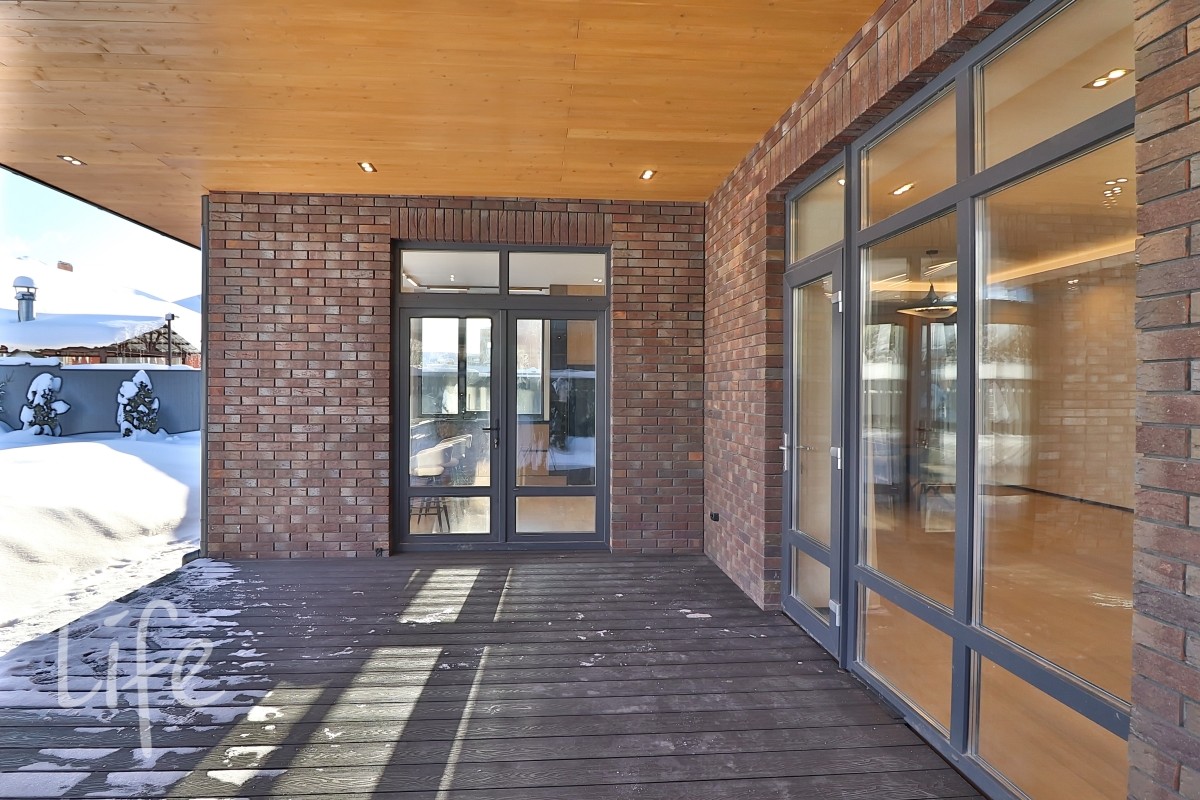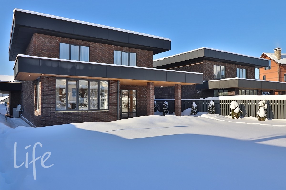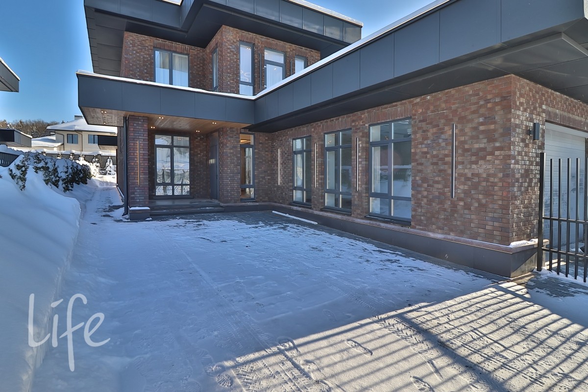 Экстерьер дома выполнен в стиле хай-тек, прямые линии, большие панорамные окна, плоская кровля с широкими свесами. Облицован клинкером. Архитектурная подсветка фасада.
