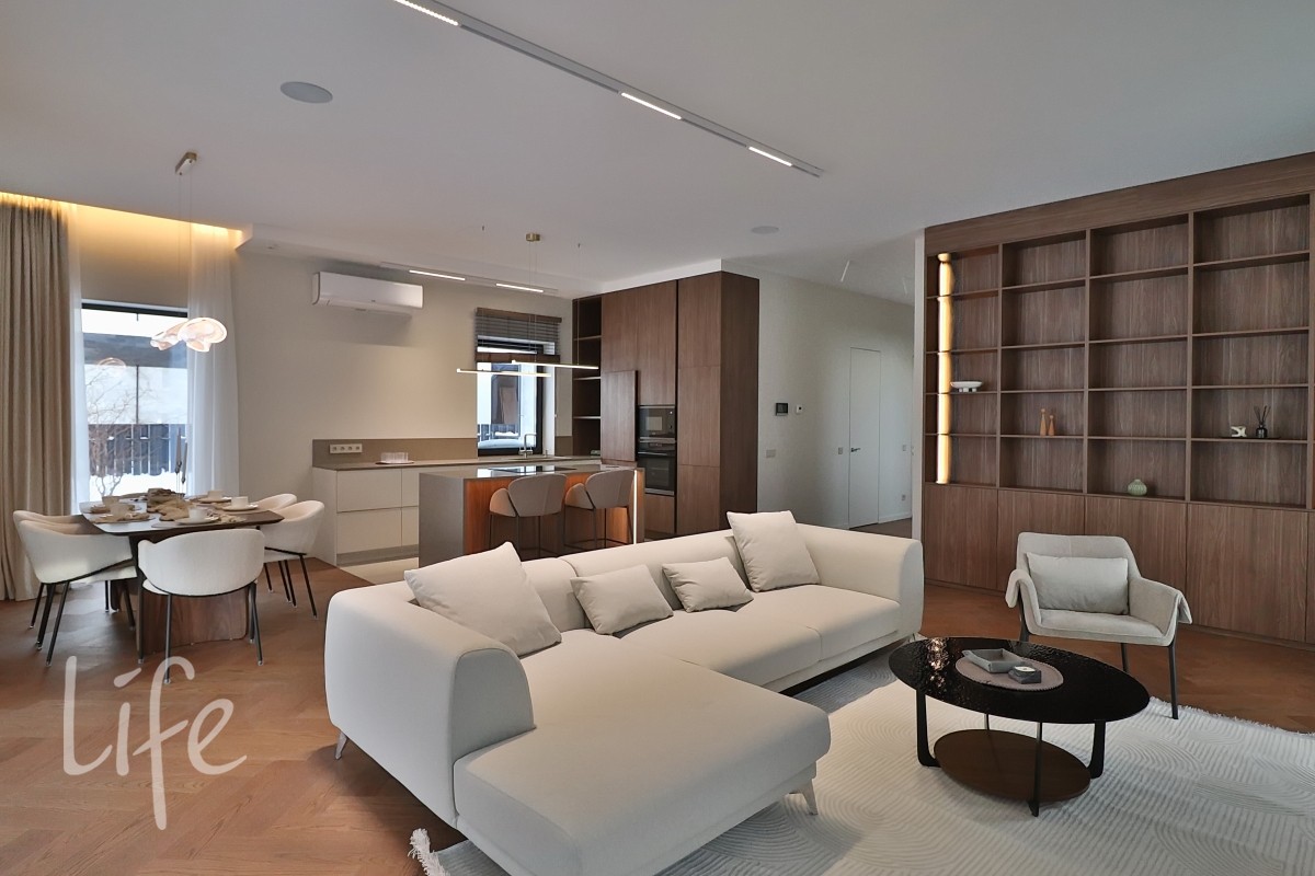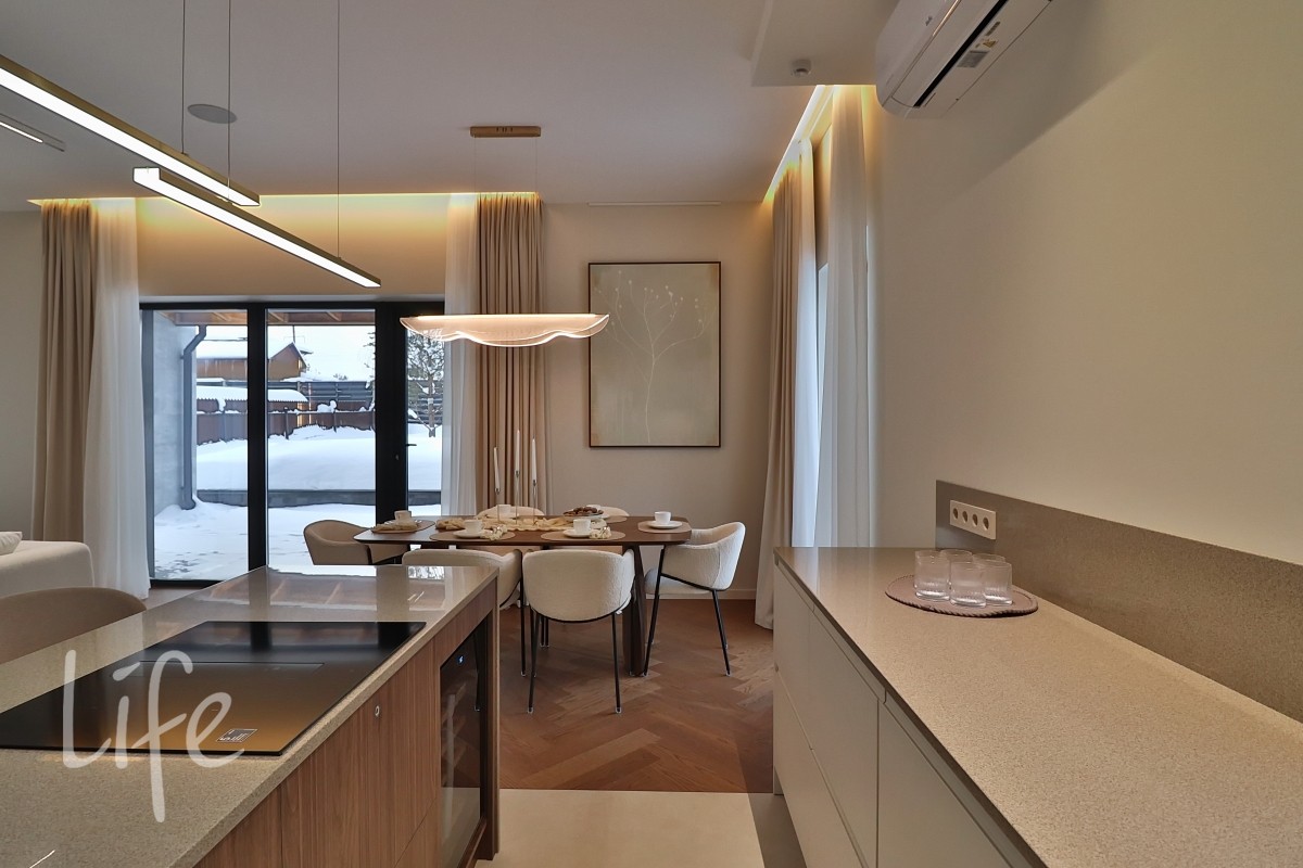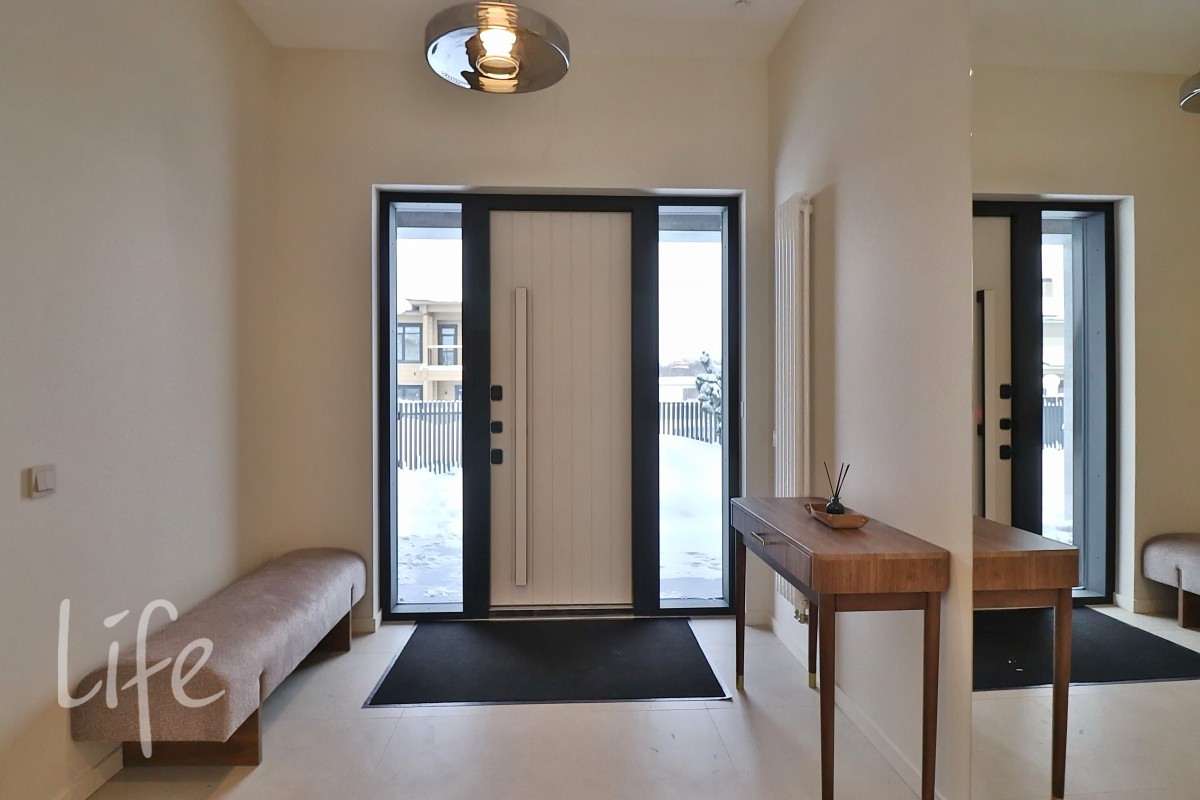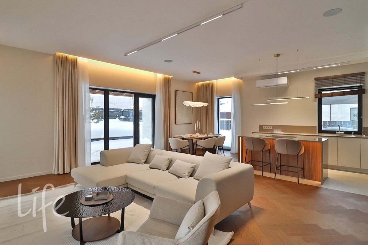 Охраняемый поселок. Новый дом полностью под ключ, меблирован и оборудован всей необходимой бытовой техникой. Большие панорамные окна, балконы.