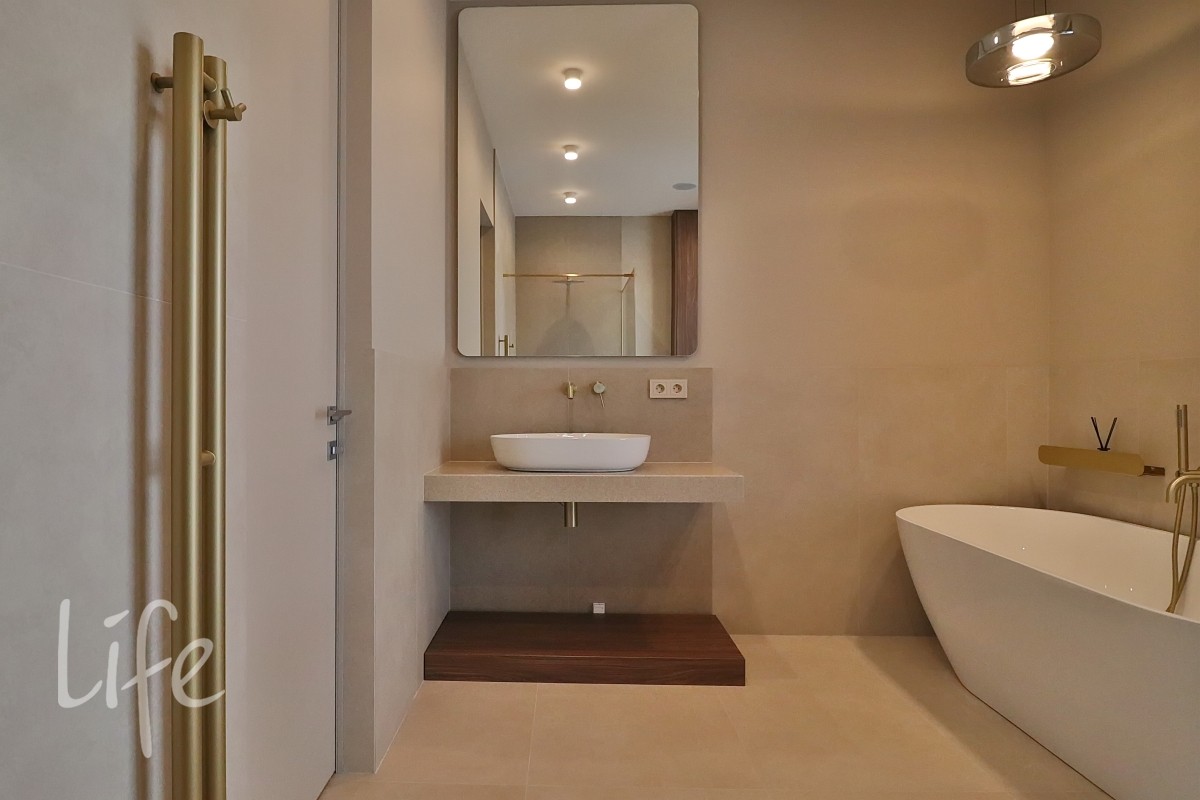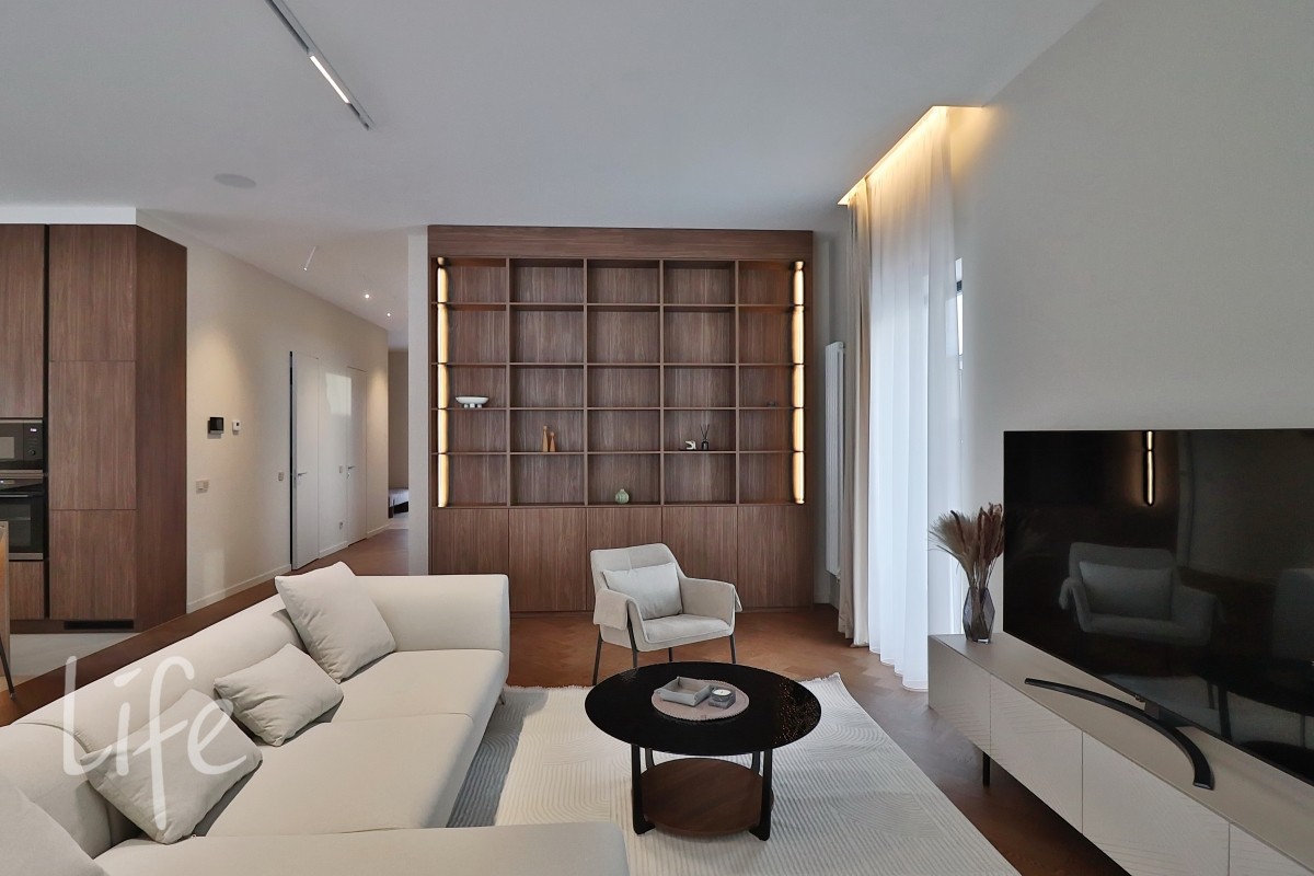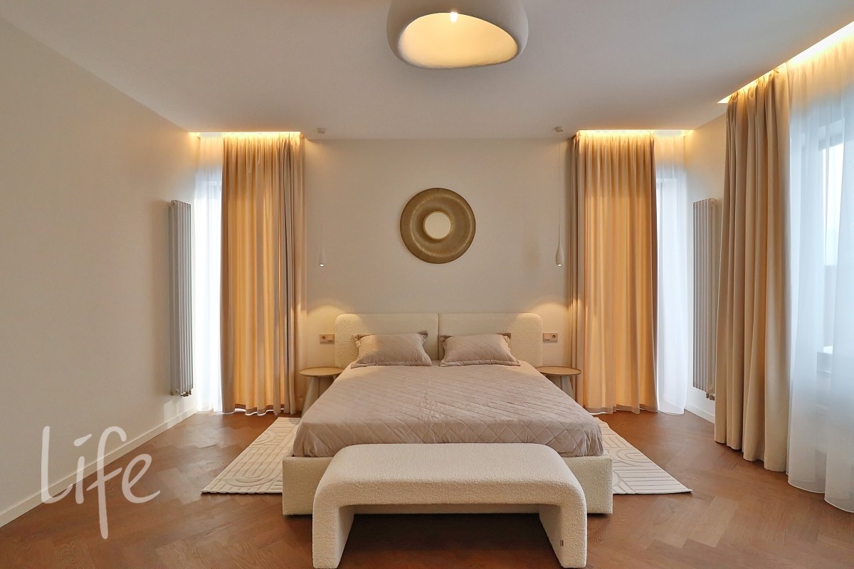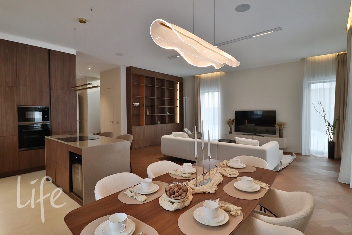 Современный дизайнерский интерьер в мягких, светлых тонах, со вкусом подобрана мебель и аксессуары. Современные системы освещения.
