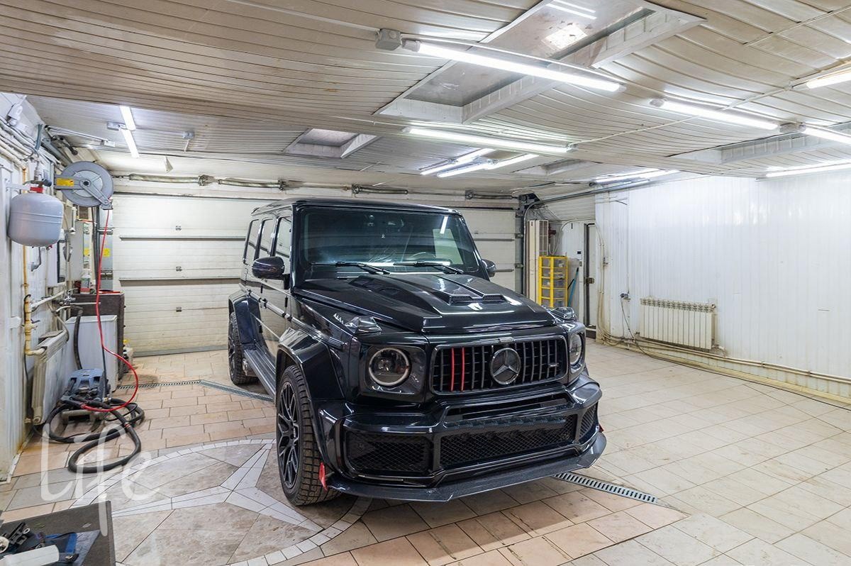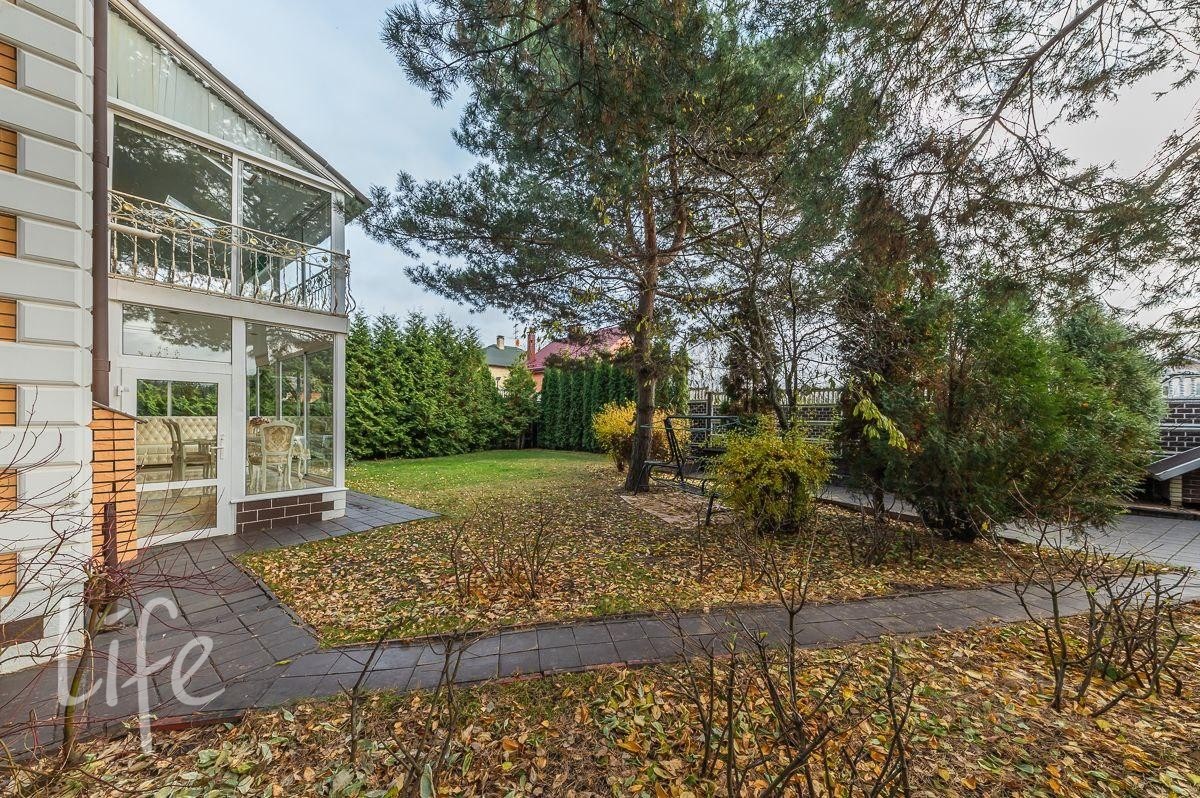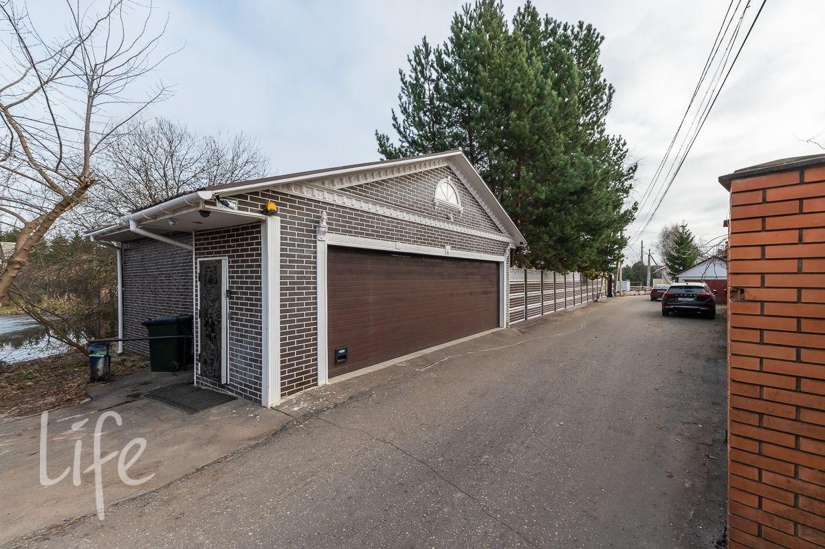 Участок правильной прямоугольной формы, с ландшафтным дизайном, по периметру посажены хвойные деревья. Парковка для автомобилей, дорожки. На территории расположен гараж на два автомобиля.