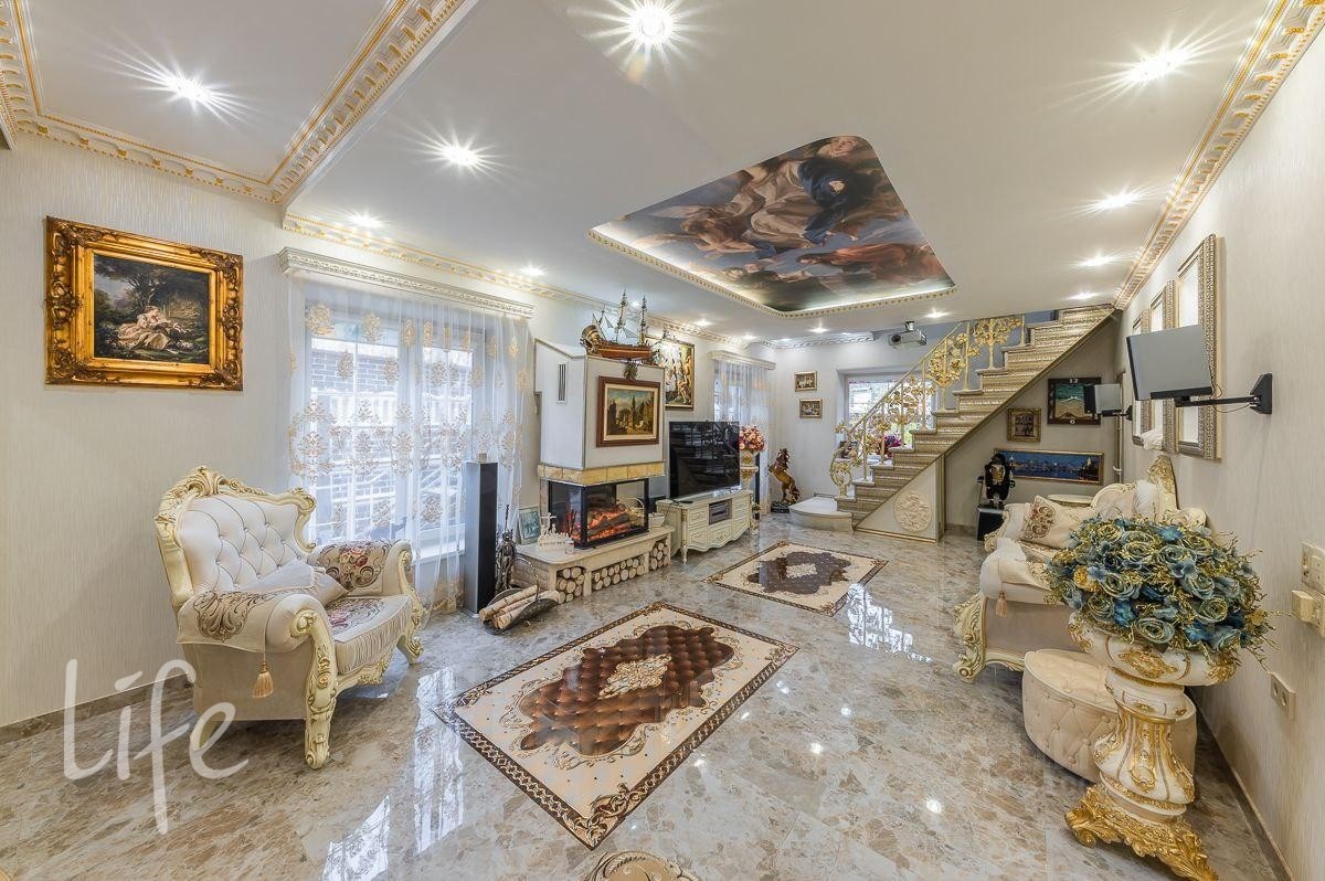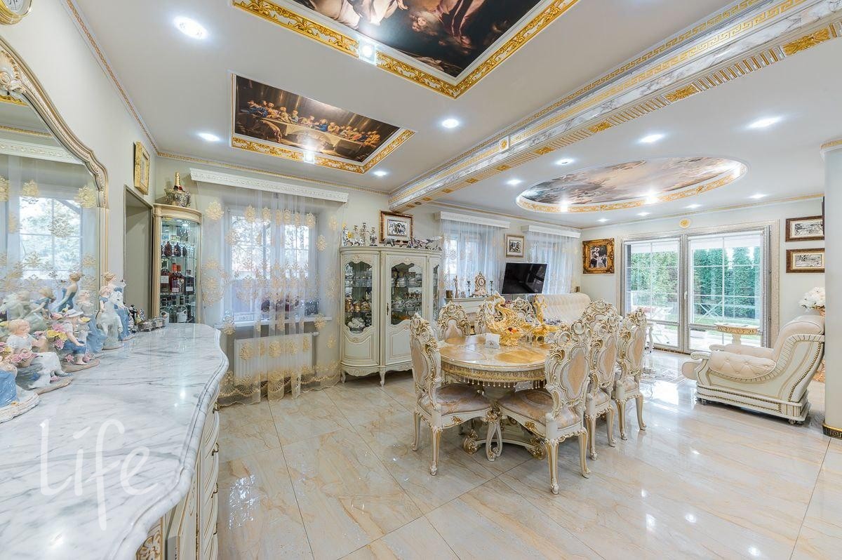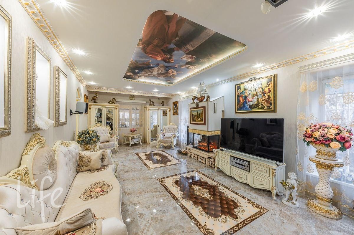 Интерьер выполнен в классическом стиле, потолок и стены украшены лепниной, со вкусом подобрана дорогая мебель и предметы быта. Гостиную украшает действующий дровяной камин.