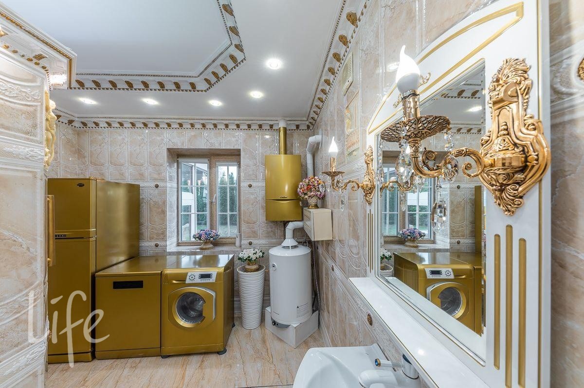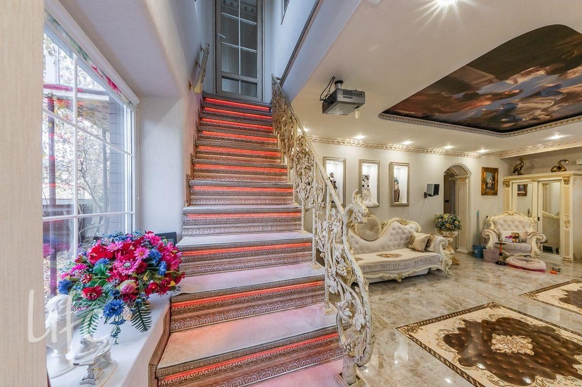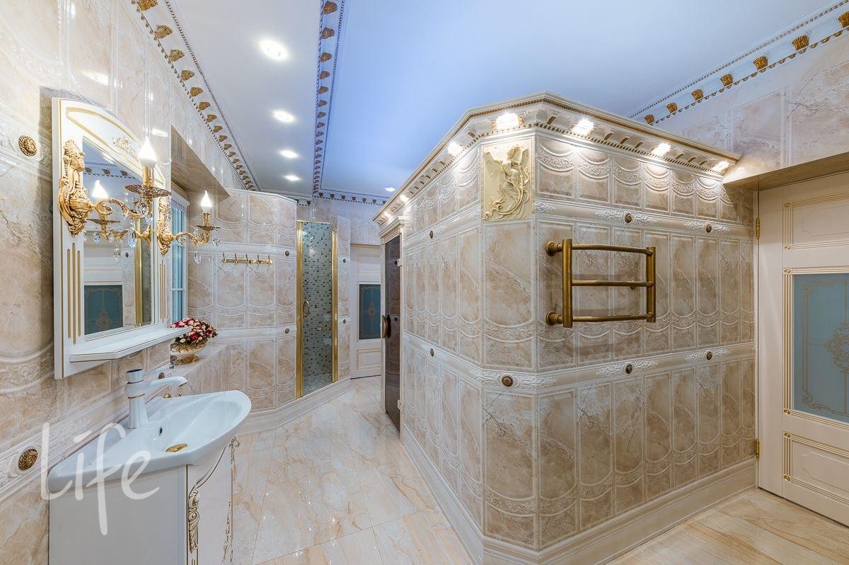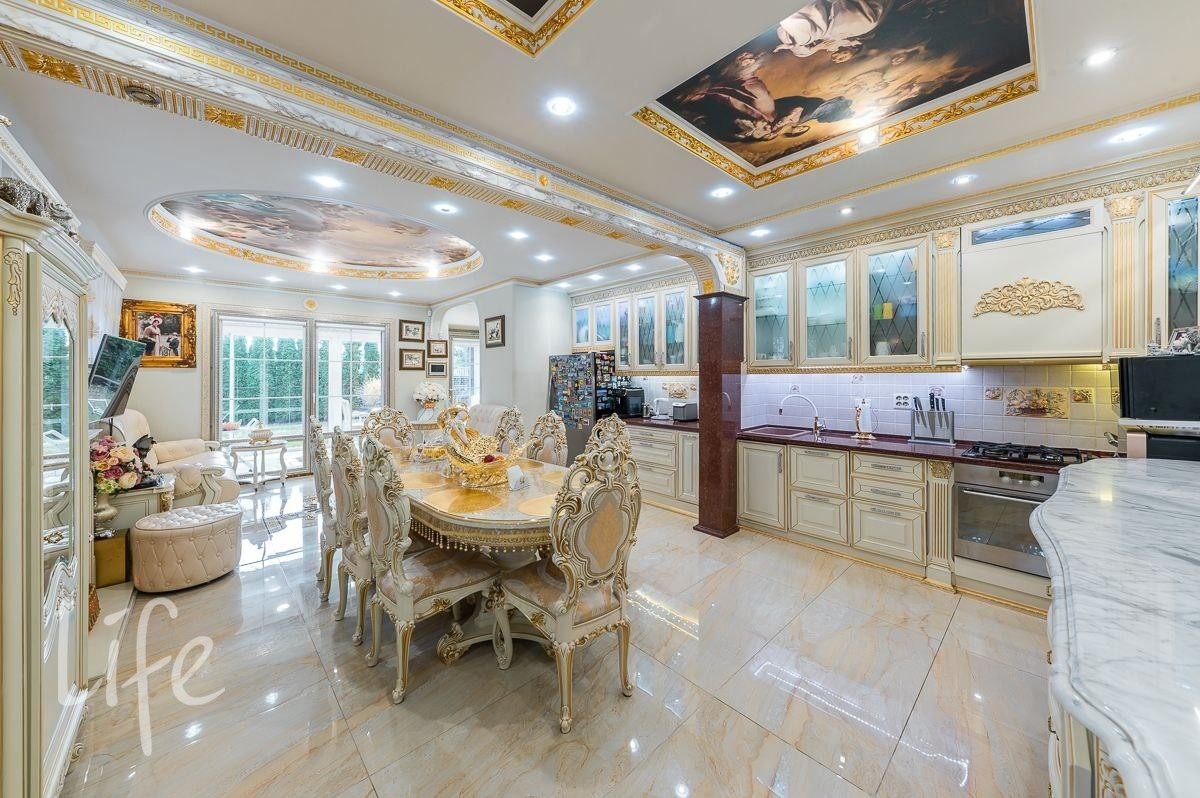 Интерьер выполнен в классическом стиле, потолок и стены украшены лепниной, со вкусом подобрана дорогая мебель и предметы быта. Гостиную украшает действующий дровяной камин.