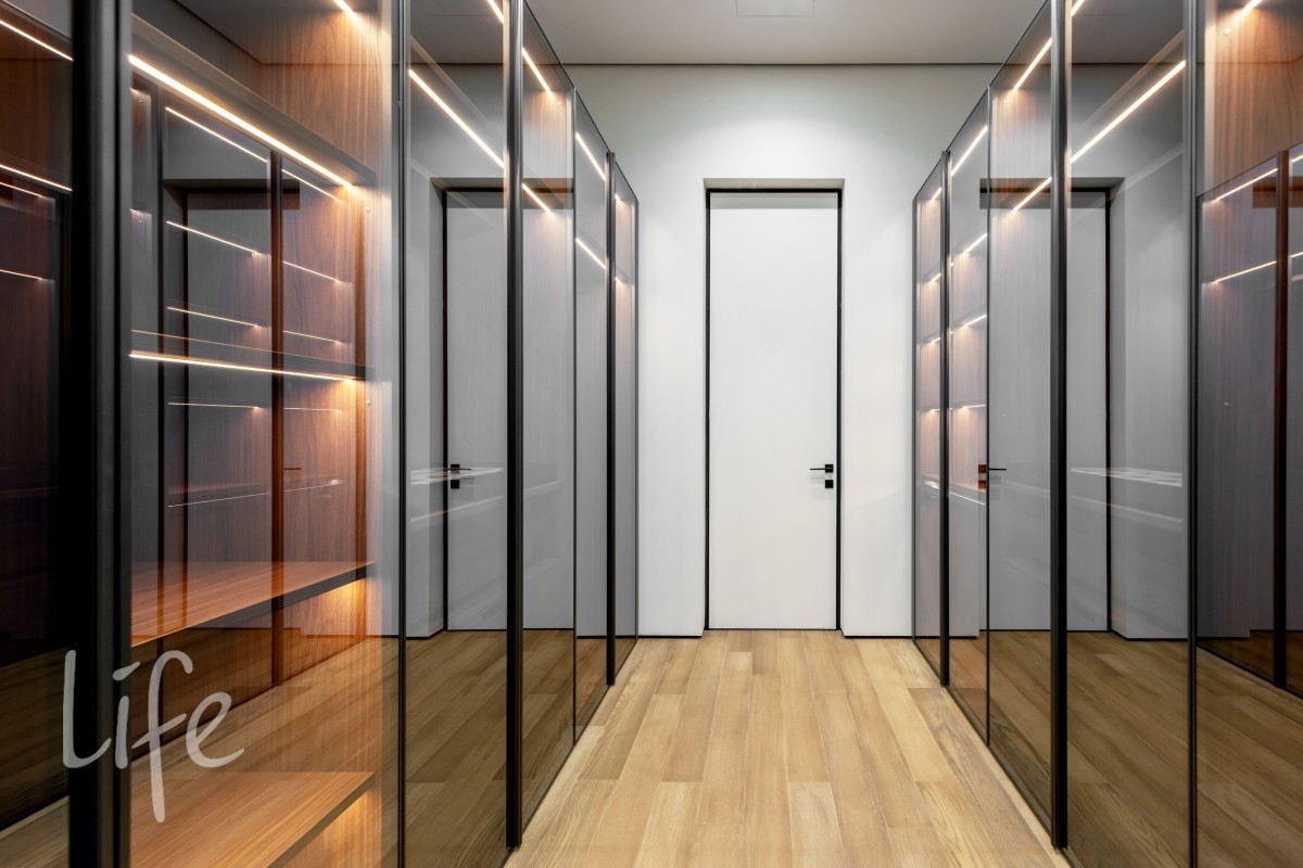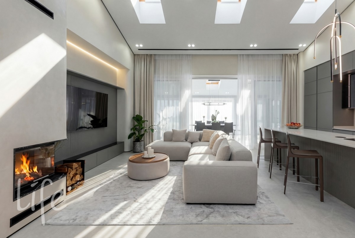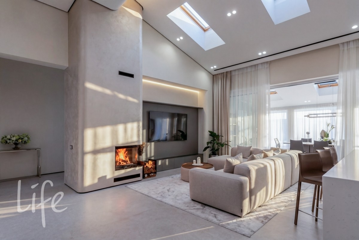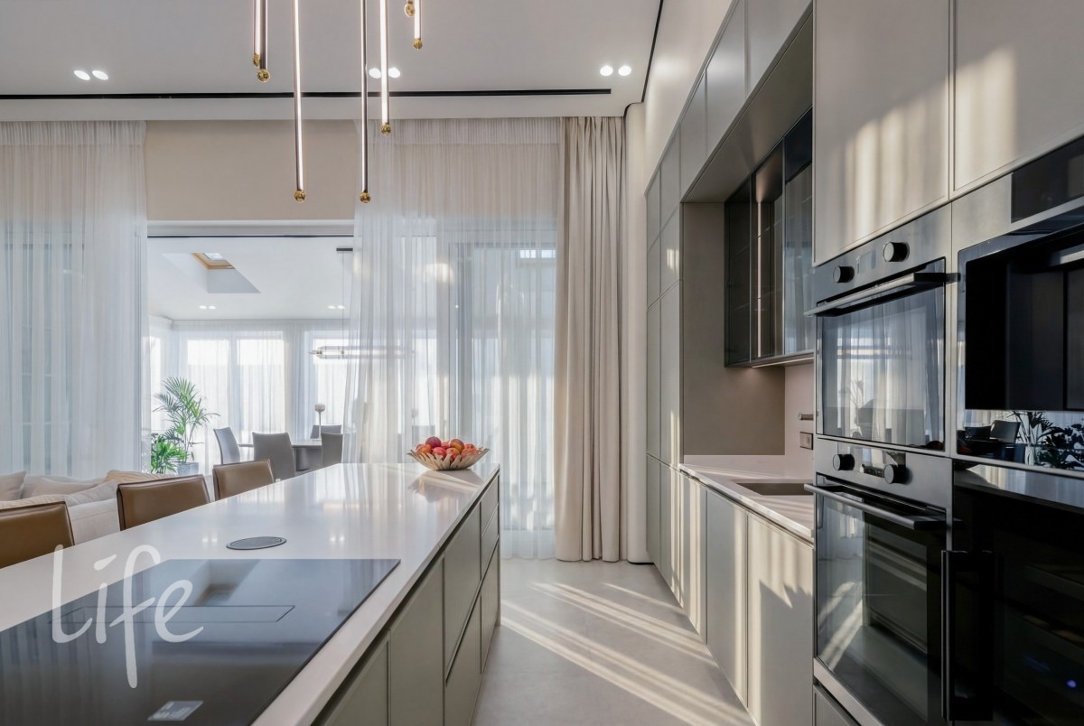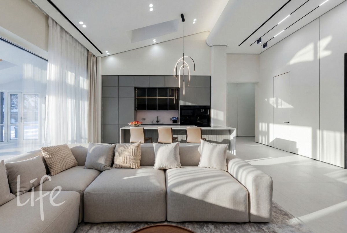 1 этаж: прихожая, гардеробная, котельная, гостевой с/у, постирочная комната c оборудованием Miele, премиальная кухня со встроенной техникой ASKO, варочная панель с вытяжкой Elica NIKOLATESLA, два холодильника Liebherr, гостиная с дровяным камином, столовая зона с панорамным остеклением и выходом на участок, черновая кухня, хозяйский блок с большой гардеробной и су, две спальни со своими гардеробными и су , кабинет.