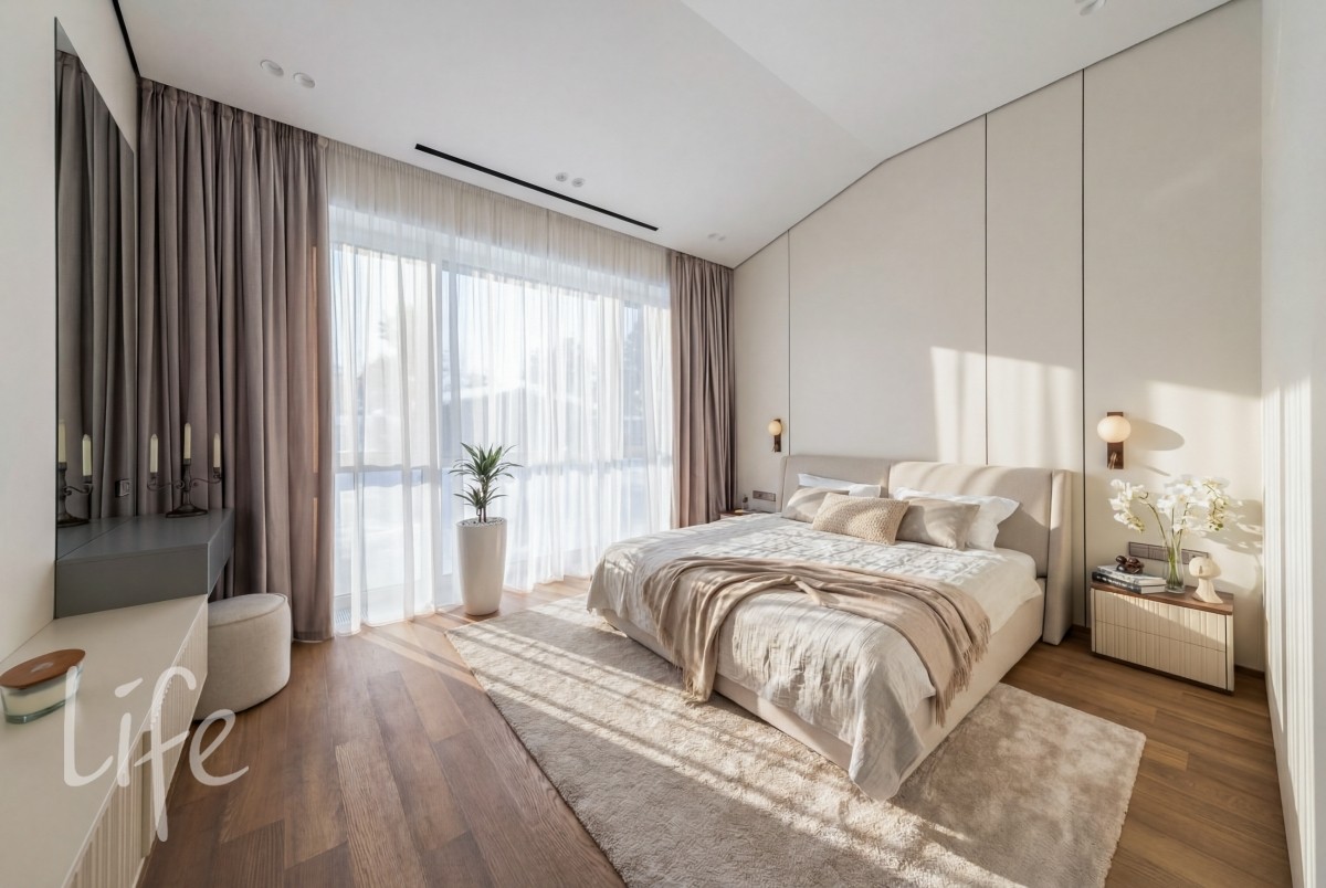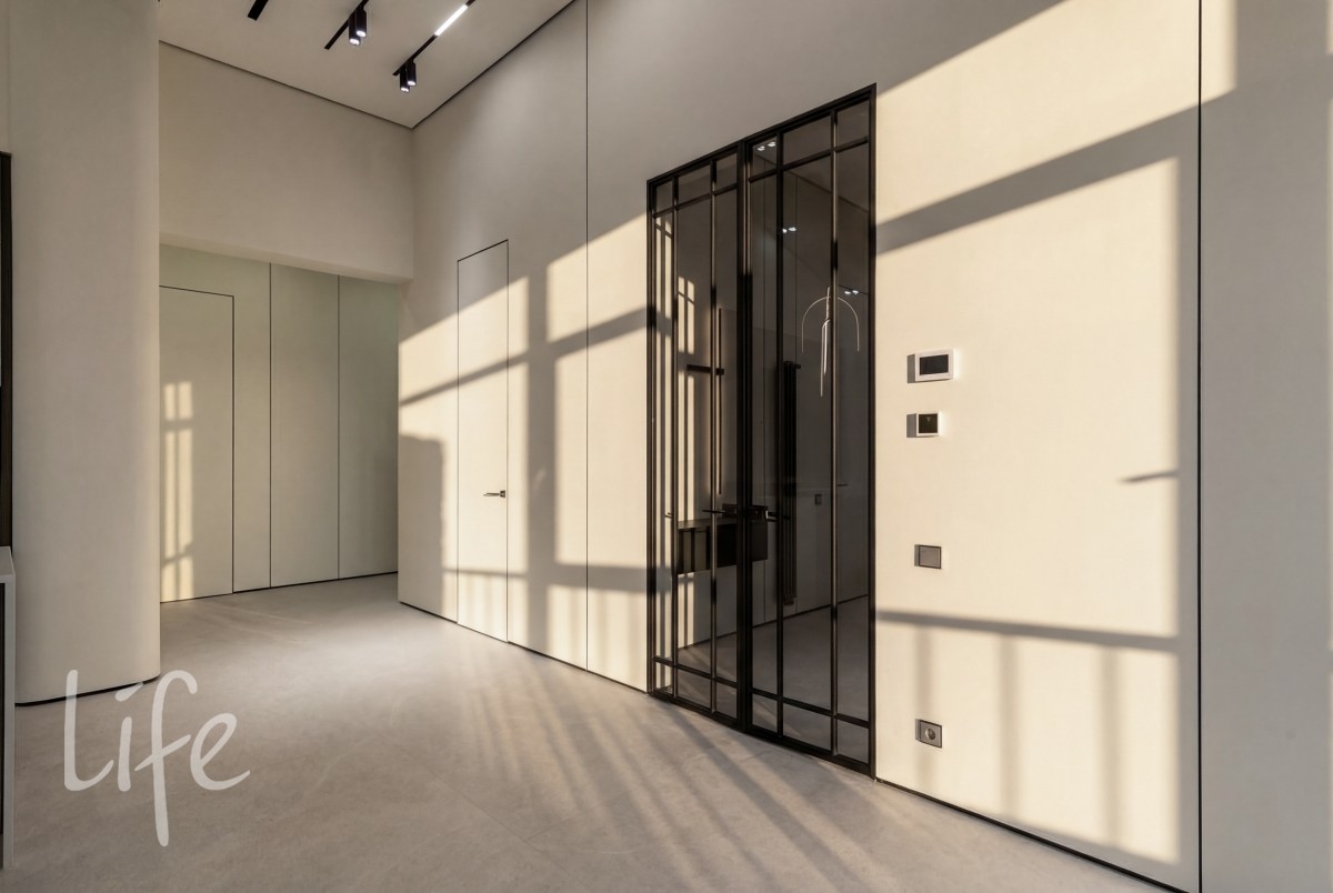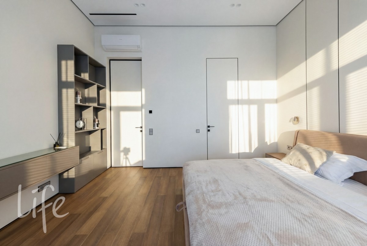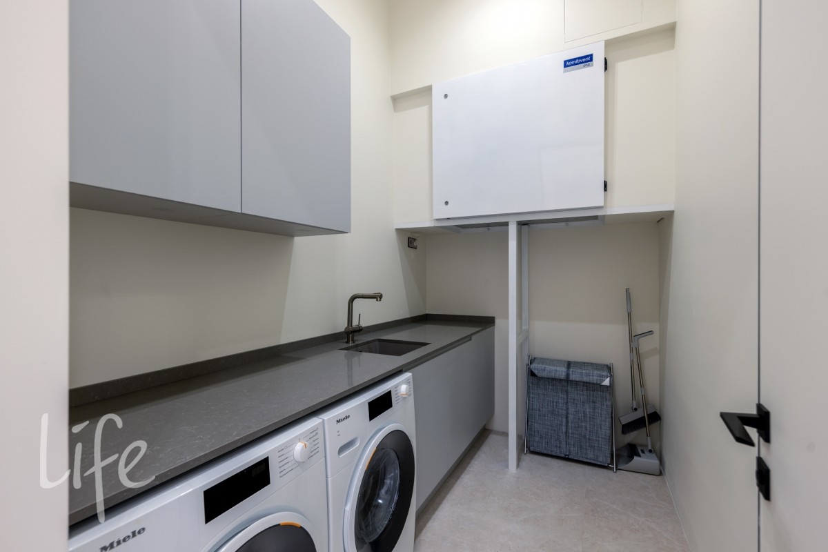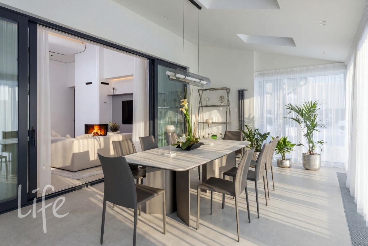 1 этаж: прихожая, гардеробная, котельная, гостевой с/у, постирочная комната c оборудованием Miele, премиальная кухня со встроенной техникой ASKO, варочная панель с вытяжкой Elica NIKOLATESLA, два холодильника Liebherr, гостиная с дровяным камином, столовая зона с панорамным остеклением и выходом на участок, черновая кухня, хозяйский блок с большой гардеробной и су, две спальни со своими гардеробными и су , кабинет.