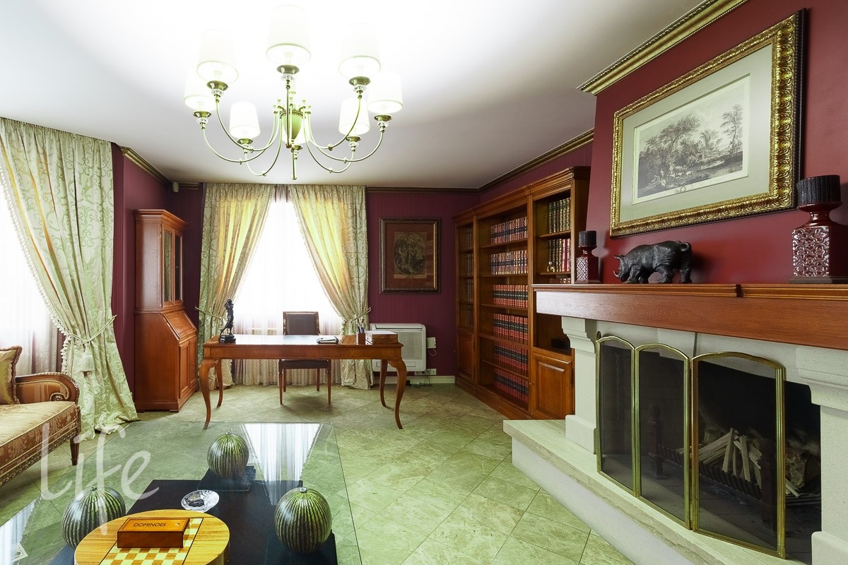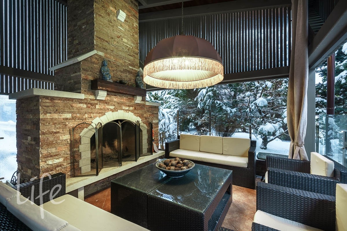 1 этаж: холл, кабинет, камин - 2 шт., санузел, кухня, гостиная, зимний сад, патио (большой уличный камин, стеклянное ограждение, клееный брус, ПВХ шторы на зиму, высокие потолки, пол и лестница клинкер, плетеная мебель).