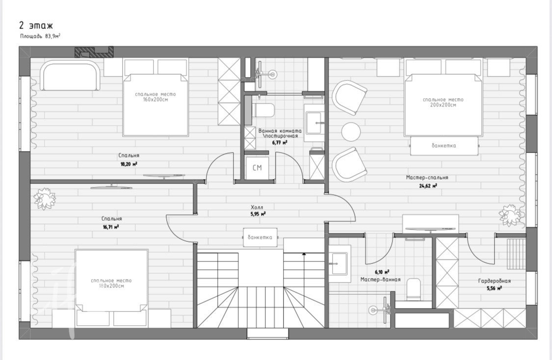 2 этаж: просторная хозяйская спальня со своей ванной комнатой и большой гардеробной, две дополнительные спальни, с/у.