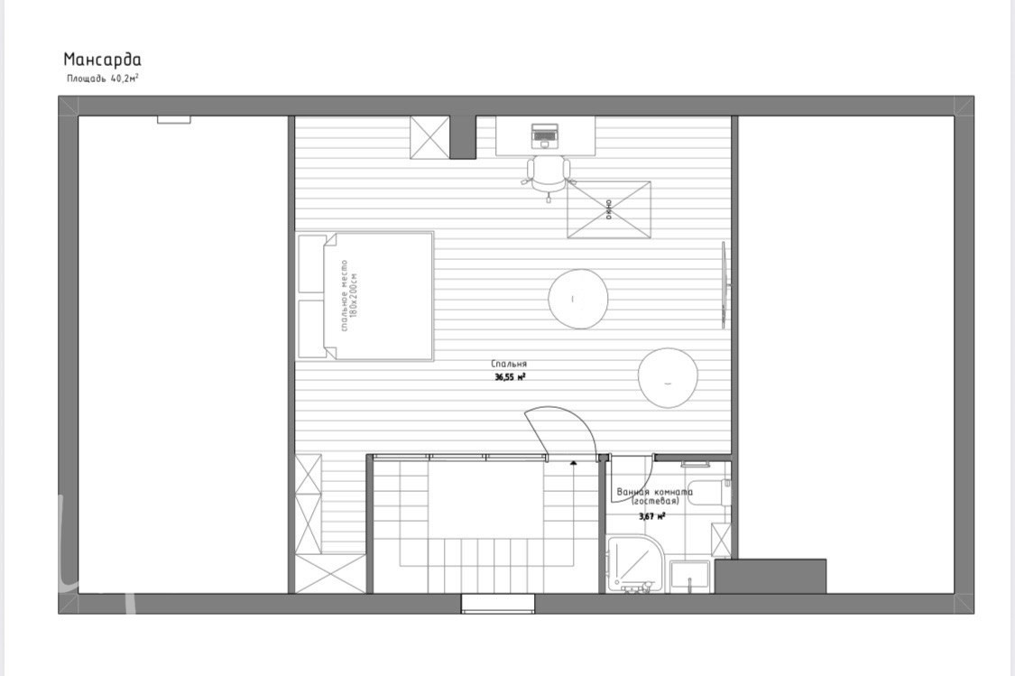 Мансарда: отдельная спальня с рабочей зоной и ванной комнатой.