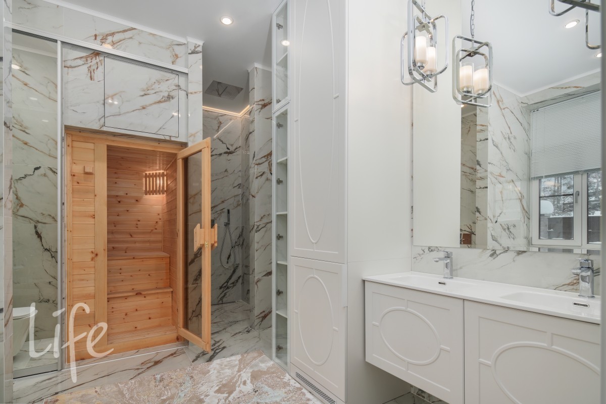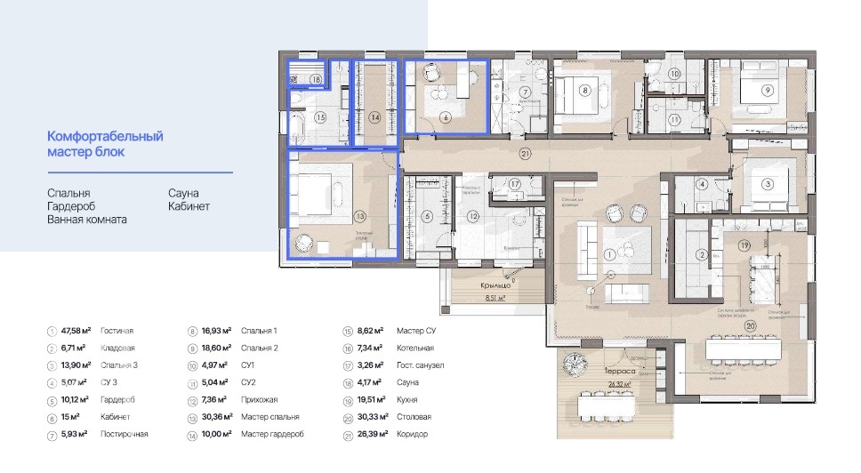 1 этаж: гостиная, столовая, спальня с су и гардеробной, кабинет, постирочная, две спальни со своими су, прихожая, мастер-спальня с гардеробной и су, котельная, гостевой су, сауна, кухня, столовая, коридор.
