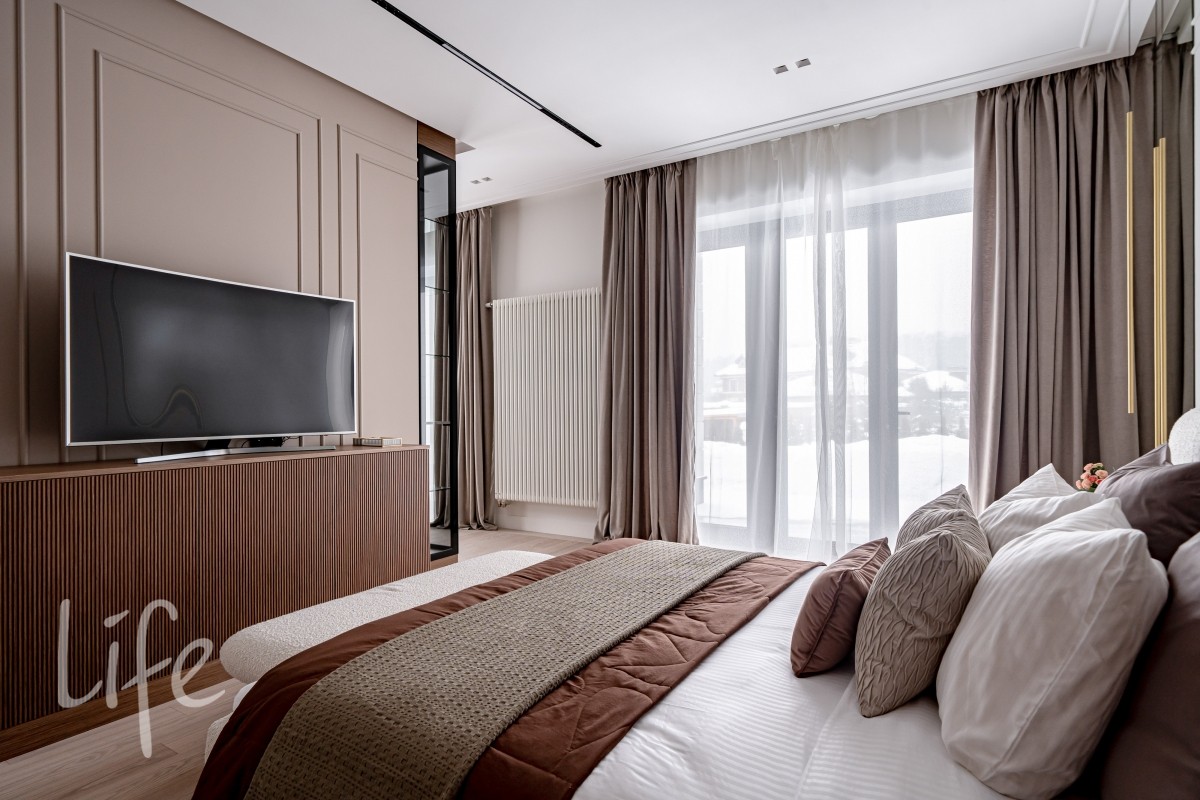 2 этаж: 4 просторные спальни, каждая из которых дополнена индивидуальным санузлом, просторный холл с видом на второй свет гостиной.