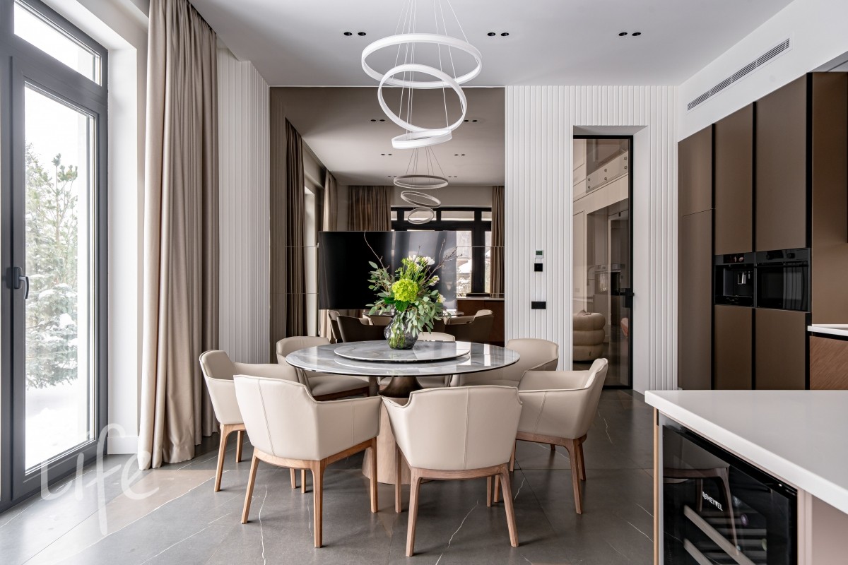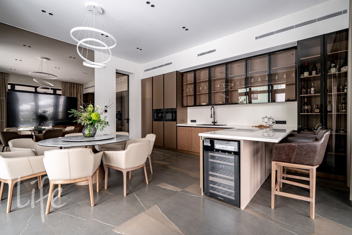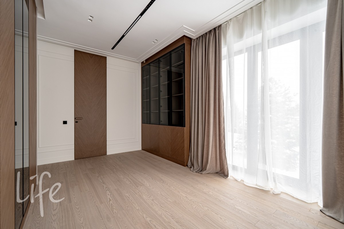 1 этаж: гостиная, кухня-столовая (Оборудована островом со встроенной вытяжкой и премиальнойтехникой ASKO, включая винный шкаф и кофемашину). Мебель от Dantone Home. Мастер-спальня, гостевая зона (спальня с собственным с/у), просторный холл, постирочная, гостевой с/у и гараж на 2 авто и 2 мотоцикла.