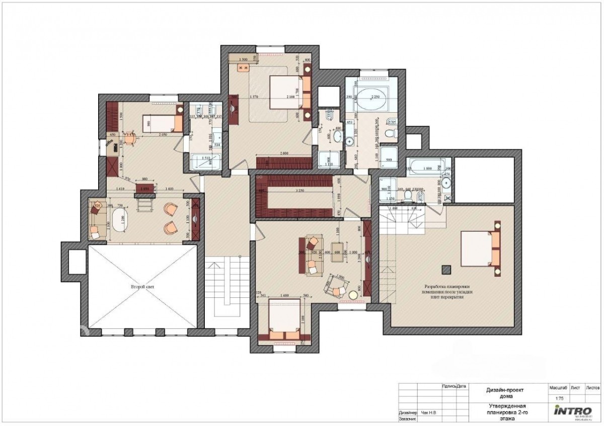 2 этаж: хозяйская спальня с гардеробной комнатой и с/у, детская с с/у, спальня с с/у.