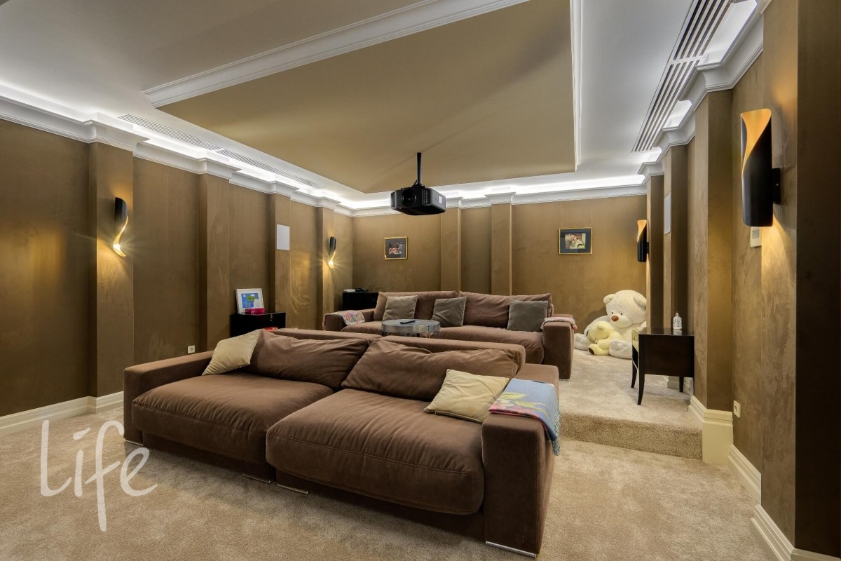 Цоколь: домашний кинотеатр, огромная гардеробная, постирочная, ванная комната, комнаты для бытовых нужд, бойлерная, оружейная, тех.помещения вентиляции и бассейна, проход к СПА-комплексу.