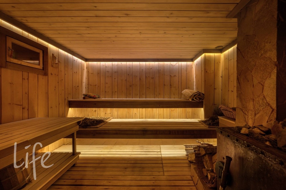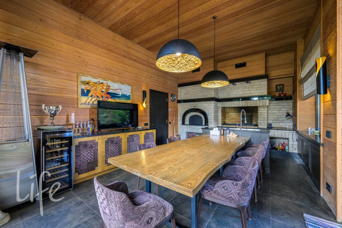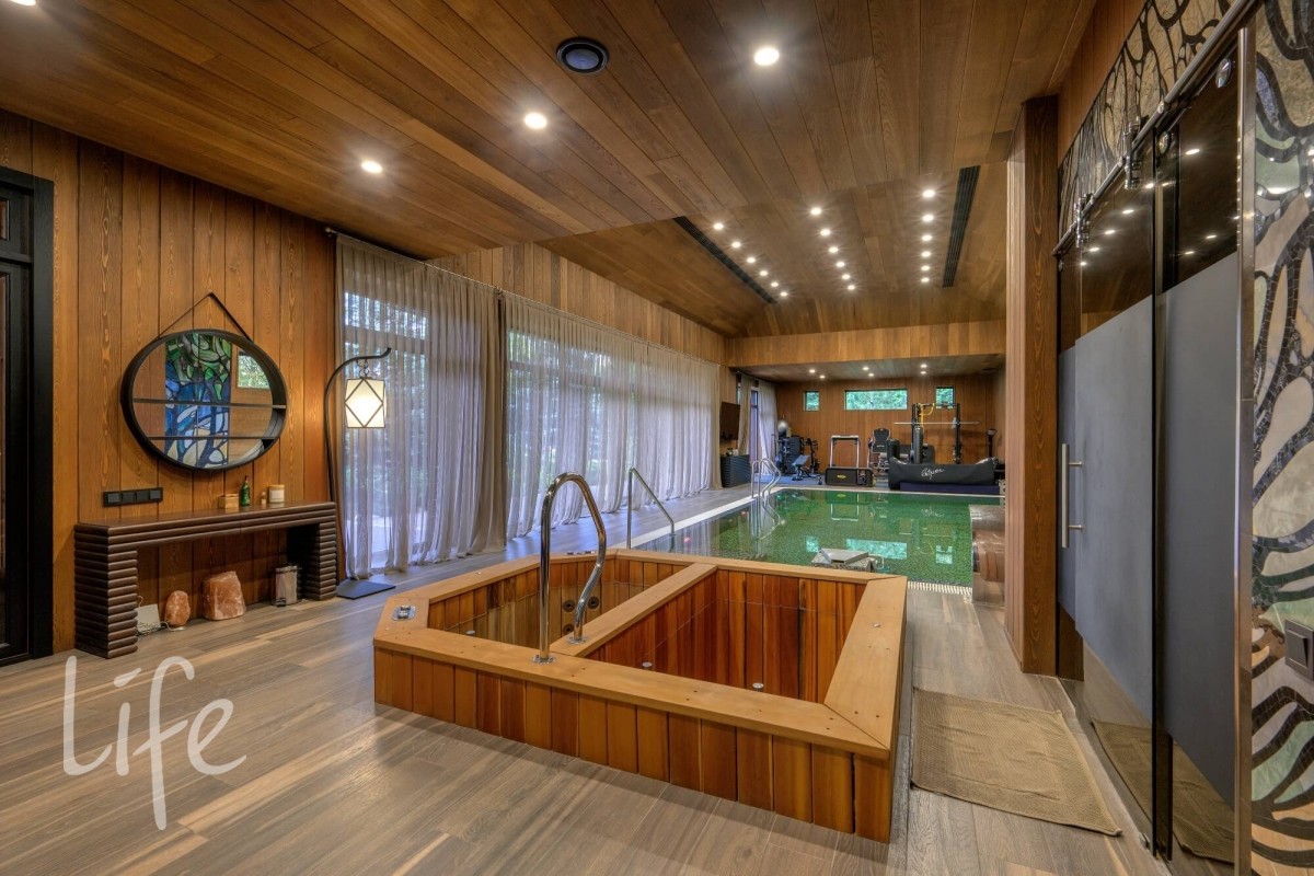 СПА-КОМПЛЕКС: Бассейн 9*4 м с противотоком, джакузи, русская баня на дровах, хаммам, две купели, раздевалка с душевой, комната отдыха с камином, помещение под барбекю и большая терраса на улице.