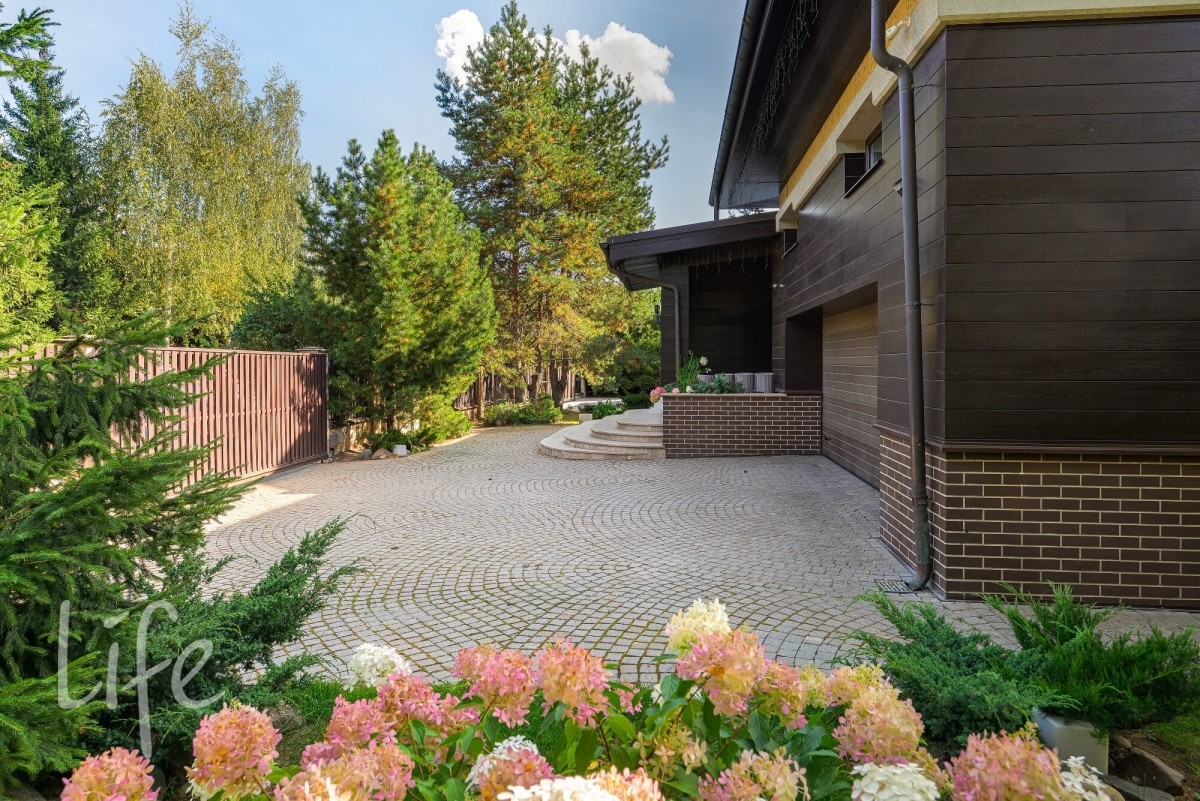 По периметру растут взрослые деревья, вокруг дома вымощены дорожки и организовано вечернее освещение.